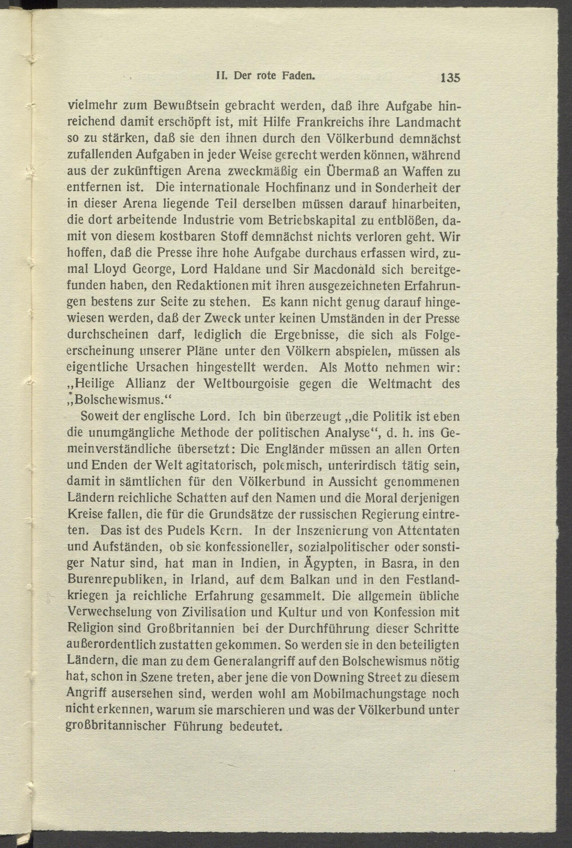 vielmehr zum Bewußtsein gebracht werden, daß ihre Aufgabe hinreichend damit erschöpft ist, mit Hilfe Frankreichs ihre Landmacht so zu stärken, daß sie den ihnen durch den Völkerbund demnächst zufallenden Aufgaben in jeder Weise gerecht werden können, während aus der zukünftigen Arena zweckmäßig ein Übermaß an Waffen zu entfernen ist. Die internationale Hochfinanz und in Sonderheit der in dieser Arena liegende Teil derselben müssen darauf hinarbeiten, die dort arbeitende Industrie vom Betriebskapital zu entblößen, damit von diesem kostbaren Stoff demnächst nichts verloren geht. Wir hoffen, daß die Presse ihre hohe Aufgabe durchaus erfassen wird, zumal Lloyd George, Lord Haldane und Sir Macdonald sich bereitgefunden haben, den Redaktionen mit ihren ausgezeichneten Erfahrungen bestens zur Seite zu stehen. Es kann nicht genug darauf hingewiesen werden, daß der Zweck unter keinen Umständen in der Presse durchscheinen darf, lediglich die Ergebnisse, die sich als Folgeerscheinung unserer Pläne unter den Völkern abspielen, müssen als eigentliche Ursachen hingestellt werden. Als Motto nehmen wir: „Heilige Allianz der Weltbourgoisie gegen die Weltmacht des Bolschewismus.“