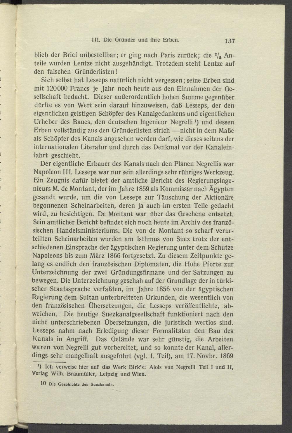 Sich selbst hat Lesseps natürlich nicht vergessen; seine Erben sind mit 120000 Francs je Jahr noch heute aus den Einnahmen der Gesellschaft bedacht. Dieser außerordentlich hohen Summe gegenüber dürfte es von Wert sein darauf hinzuweisen, daß Lesseps, der den eigentlichen geistigen Schöpfer des Kanalgedankens und eigentlichen Urheber des Baues, den deutschen Ingenieur Negrelli 1 ) und dessen Erben vollständig aus den Gründerlisten strich —nicht in dem Maße als Schöpfer des Kanals angesehen werden darf, wie dieses seitens der internationalen Literatur und durch das Denkmal vor der Kanaleinfahrt geschieht.