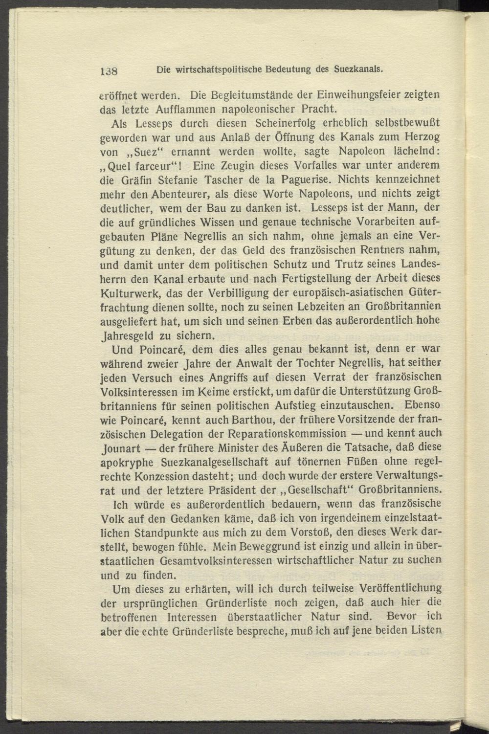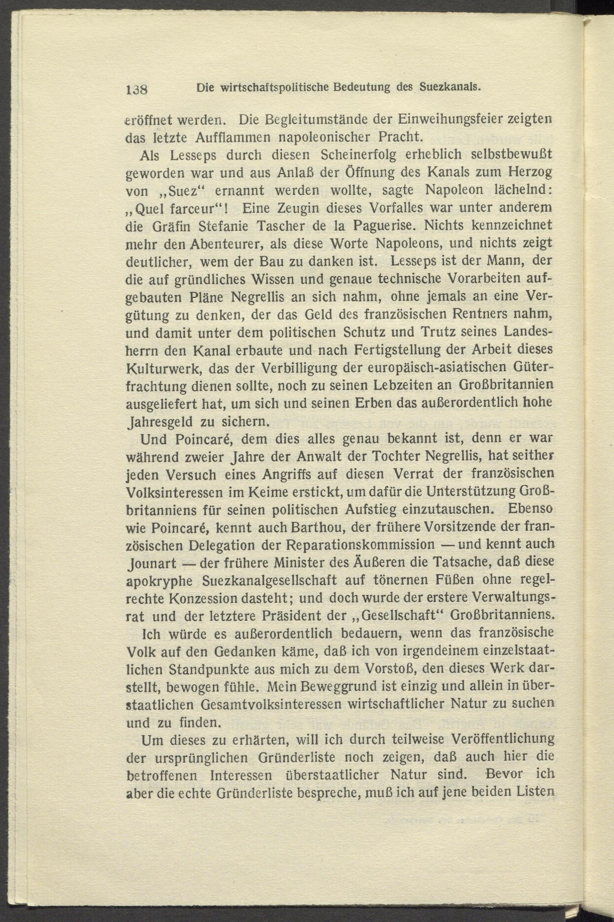 Als Lesseps durch diesen Scheinerfolg erheblich selbstbewußt geworden war und aus Anlaß der Öffnung des Kanals zum Herzog von „Suez“ ernannt werden wollte, sagte Napoleon lächelnd: „Quel farceur“! Eine Zeugin dieses Vorfalles war unter anderem die Gräfin Stefanie Tascher de la Paguerise. Nichts kennzeichnet mehr den Abenteurer, als diese Worte Napoleons, und nichts zeigt deutlicher, wem der Bau zu danken ist. Lesseps ist der Mann, der die auf gründliches Wissen und genaue technische Vorarbeiten aufgebauten Pläne Negrellis an sich nahm, ohne jemals an eine Vergütung zu denken, der das Geld des französischen Rentners nahm, und damit unter dem politischen Schutz und Trutz seines Landesherrn den Kanal erbaute und nach Fertigstellung der Arbeit dieses Kulturwerk, das der Verbilligung der europäisch-asiatischen Güter- frachtung dienen sollte, noch zu seinen Lebzeiten an Großbritannien ausgeliefert hat, um sich und seinen Erben das außerordentlich hohe Jahresgeld zu sichern.