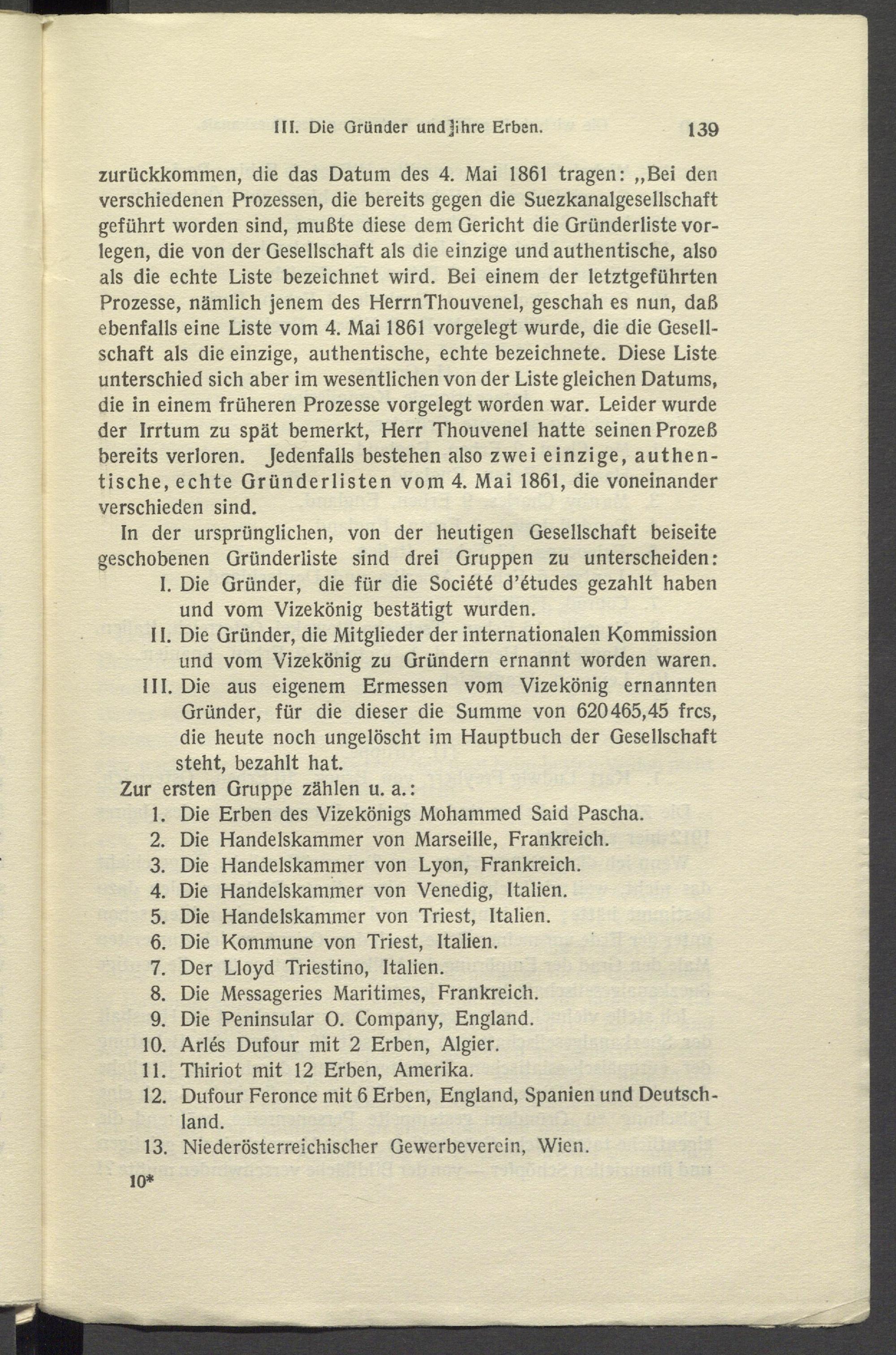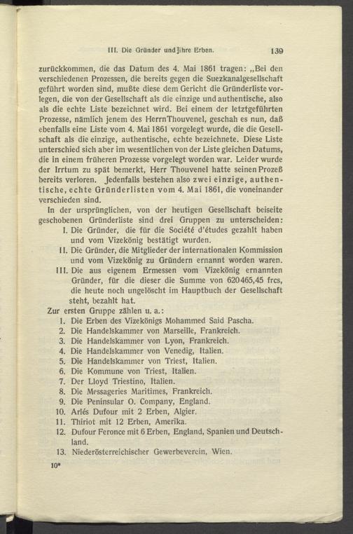 zurückkommen, die das Datum des 4. Mai 1861 tragen: „Bei den verschiedenen Prozessen, die bereits gegen die Suezkanalgesellschaft geführt worden sind, mußte diese dem Gericht die Gründerliste vorlegen, die von der Gesellschaft als die einzige und authentische, also als die echte Liste bezeichnet wird. Bei einem der letztgeführten Prozesse, nämlich jenem des HerrnThouvenel, geschah es nun, daß ebenfalls eine Liste vom 4. Mai 1861 vorgelegt wurde, die die Gesellschaft als die einzige, authentische, echte bezeichnete. Diese Liste unterschied sich aber im wesentlichen von der Liste gleichen Datums, die in einem früheren Prozesse vorgelegt worden war. Leider wurde der Irrtum zu spät bemerkt, Herr Thouvenel hatte seinen Prozeß bereits verloren. Jedenfalls bestehen also zwei einzige, authentische, echte Gründerlisten vom 4. Mai 1861, die voneinander verschieden sind.