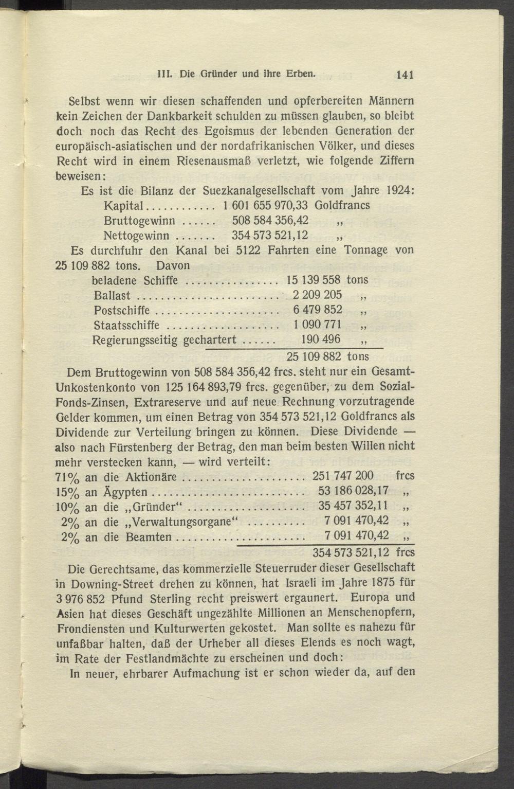 Dem Bruttogewinn von 508 584 356,42 frcs. steht nur ein Gesamt- Unkostenkonto von 125 164 893,79 frcs. gegenüber, zu dem Sozial- Fonds-Zinsen, Extrareserve und auf neue Rechnung vorzutragende Gelder kommen, um einen Betrag von 354 573 521,12 Goldfrancs als Dividende zur Verteilung bringen zu können. Diese Dividende — also nach Fürstenberg der Betrag, den man beim besten Willen nicht mehr verstecken kann, —wird verteilt: