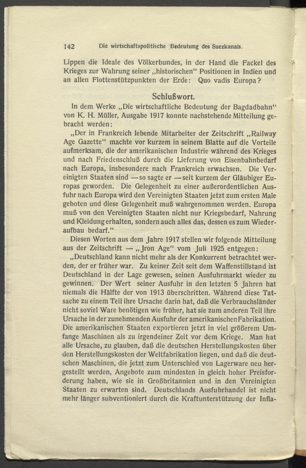 „Deutschland kann nicht mehr als der Konkurrent betrachtet werden, der er früher war. Zu keiner Zeit seit dem Waffenstillstand ist Deutschland in der Lage gewesen, seinen Ausfuhrmarkt wieder zu gewinnen. Der Wert seiner Ausfuhr in den letzten 5 Jahren hat niemals die Hälfte der von 1913 überschritten. Während diese Tatsache zu einem Teil ihre Ursache darin hat, daß die Verbrauchsländer nicht soviel Ware benötigen wie früher, hat sie zum anderen Teil ihre Ursache in der zunehmenden Ausfuhr der amerikanischenFabrikation. Die amerikanischen Staaten exportieren jetzt in viel größerem Umfange Maschinen als zu irgendeiner Zeit vor dem Kriege. Man hat alle Ursache, zu glauben, daß die deutschen Herstellungskosten über den Herstellungskosten der Weltfabrikation liegen, und daß die deutschen Maschinen, die jetzt zum Unterschied von Lagerware neu hergestellt werden, Angebote zum mindesten in gleich hoher Preisforderung haben, wie sie in Großbritannien und in den Vereinigten Staaten zu erwarten sind. Deutschlands Ausfuhrhandel ist nicht mehr länger subventioniert durch die Kraftunterstützung der Infla-