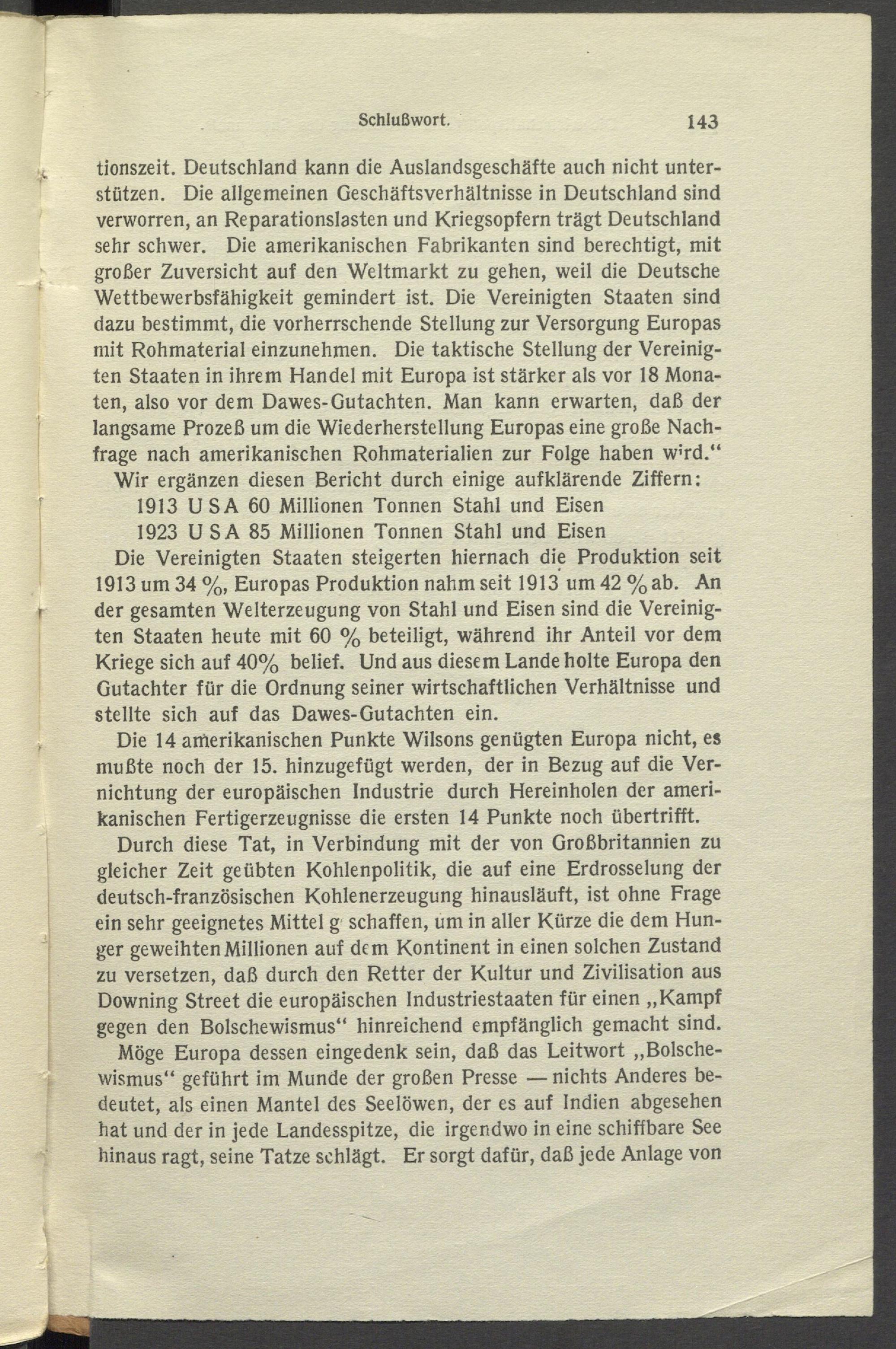 Die 14 amerikanischen Punkte Wilsons genügten Europa nicht, es mußte noch der 15. hinzugefügt werden, der in Bezug auf die Vernichtung der europäischen Industrie durch Hereinholen der amerikanischen Fertigerzeugnisse die ersten 14 Punkte noch übertrifft.
