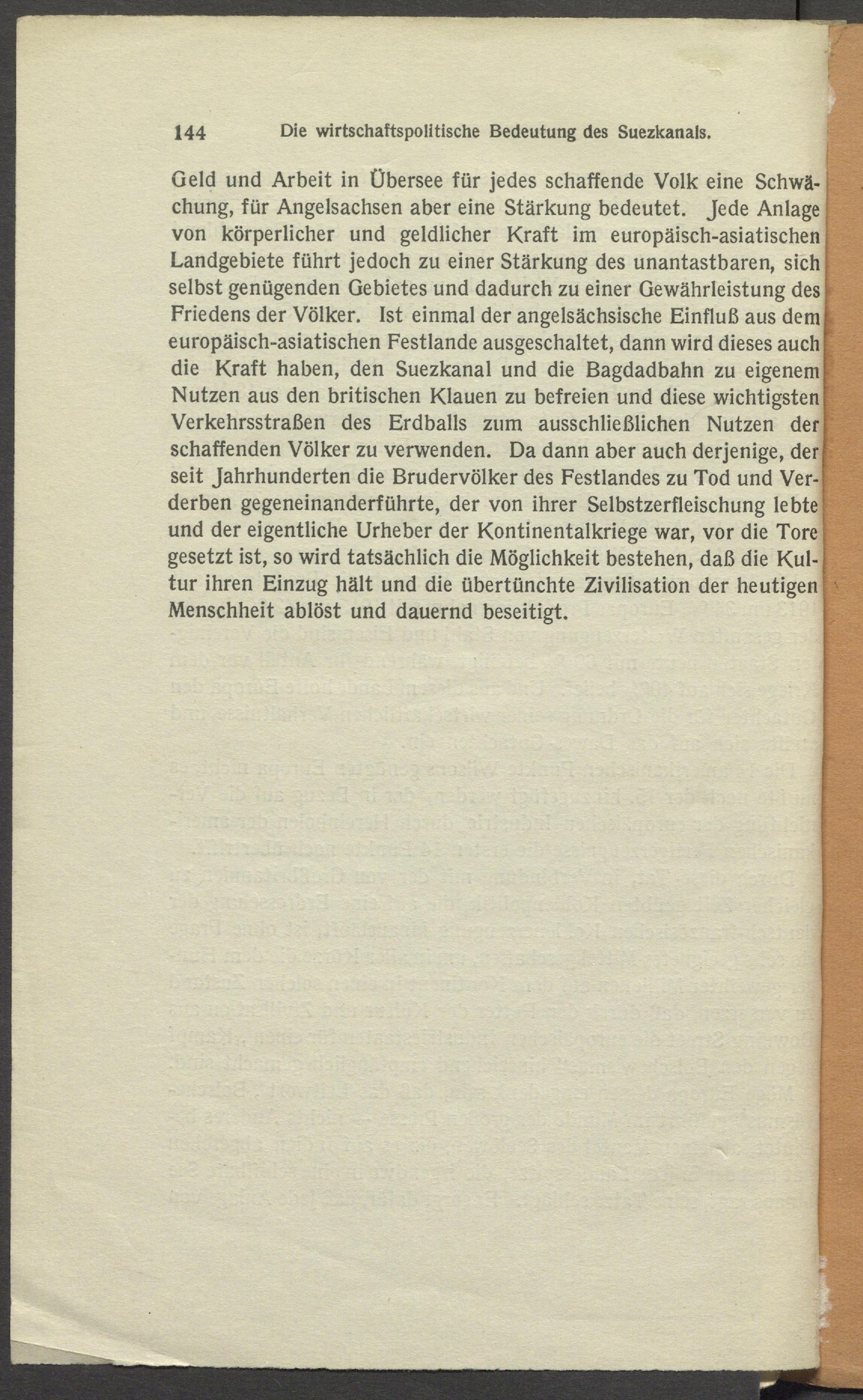 Geld und Arbeit in Übersee für jedes schaffende Volk eine Schwächung, für Angelsachsen aber eine Stärkung bedeutet. Jede Anlage von körperlicher und geldlicher Kraft im europäisch-asiatischen! Landgebiete führt jedoch zu einer Stärkung des unantastbaren, sich selbst genügenden Gebietes und dadurch zu einer Gewährleistung des Friedens der Völker. Ist einmal der angelsächsische Einfluß aus dem europäisch-asiatischen Festlande ausgeschaltet, dann wird dieses auch die Kraft haben, den Suezkanal und die Bagdadbahn zu eigenem Nutzen aus den britischen Klauen zu befreien und diese wichtigsten Verkehrsstraßen des Erdballs zum ausschließlichen Nutzen der schaffenden Völker zu verwenden. Da dann aber auch derjenige, der seit Jahrhunderten die Brudervölker des Festlandes zu Tod und Verderben gegeneinanderführte, der von ihrer Selbstzerfleischung lebte und der eigentliche Urheber der Kontinentalkriege war, vor die Tore gesetzt ist, so wird tatsächlich die Möglichkeit bestehen, daß die Kultur ihren Einzug hält und die übertünchte Zivilisation der heutigen Menschheit ablöst und dauernd beseitigt.