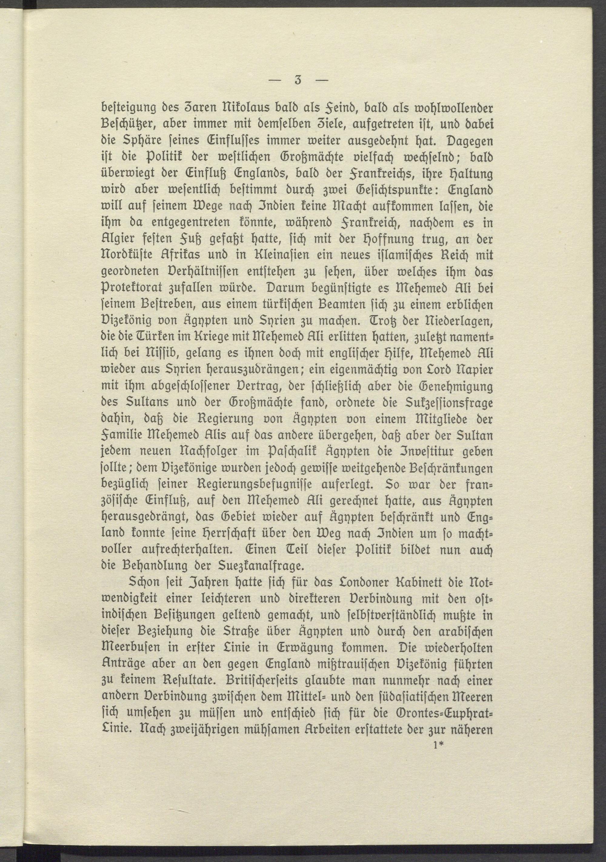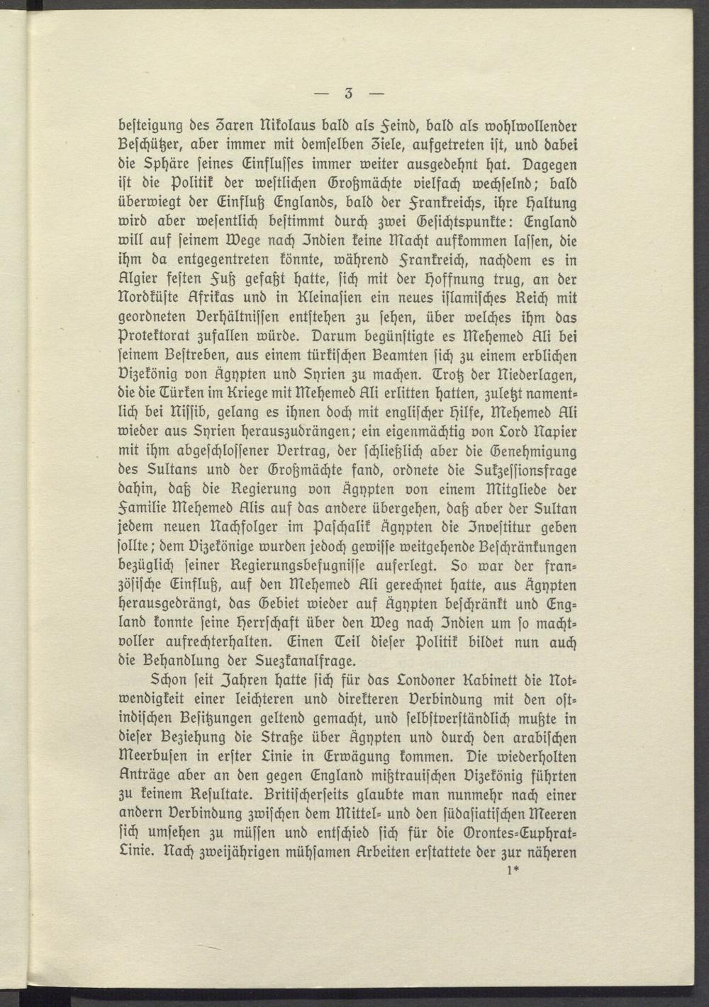 besteigung des 3aren Nikolaus bald als Feind, bald als wohlwollender Beschützer, aber immer mit demselben 3iele, aufgetreten ist, und dabei die Sphäre seines Einflusses immer weiter ausgedehnt hat. Dagegen ist die Politik der westlichen Großmächte vielfach wechselnd; bald überwiegt der Einfluß Englands, bald der Frankreichs, ihre Haltung wird aber wesentlich bestimmt durch zwei Gesichtspunkte: England will auf seinem Wege nach Indien keine Macht aufkommen lassen, die ihm da entgegentreten könnte, während Frankreich, nachdem es in Algier festen Fuß gefaßt hatte, sich mit der Hoffnung trug, an der Nordküste Afrikas und in Kleinasien ein neues islamisches Reich mit geordneten Verhältnissen entstehen zu sehen, über welches ihm das Protektorat zufallen würde. Darum begünstigte es Mehemed Ali bei seinem Bestreben, aus einem türkischen Beamten sich zu einem erblichen Dizekönig von Ägypten und Syrien zu machen. Trotz der Niederlagen, die die Türken im Kriege mit Mehemed Ali erlitten hatten, zuletzt namentlich bei Nissib, gelang es ihnen doch mit englischer Hilfe, Mehemed Ali wieder aus Syrien herauszudrängen; ein eigenmächtig von Lord Napier mit ihm abgeschlossener Vertrag, der schließlich aber die Genehmigung des Sultans und der Großmächte fand, ordnete die Sukzessionsfrage dahin, daß die Regierung von Ägypten von einem Mitgliede der Familie Mehemed Alis auf das andere übergehen, daß aber der Sultan jedem neuen Nachfolger im Paschalik Ägypten die Investitur geben sollte; dem Vizekönige wurden jedoch gewisse weitgehende Beschränkungen bezüglich seiner Regierungsbefugnisse auferlegt. So war der französische Einfluß, auf den Mehemed Ali gerechnet hatte, aus Ägypten herausgedrängt, das Gebiet wieder auf Ägypten beschränkt und Eng= land konnte seine Herrschaft über den Weg nach Indien um so machtvoller aufrechterhalten. Einen Teil dieser Politik bildet nun auch die Behandlung der Suezkanalfrage.