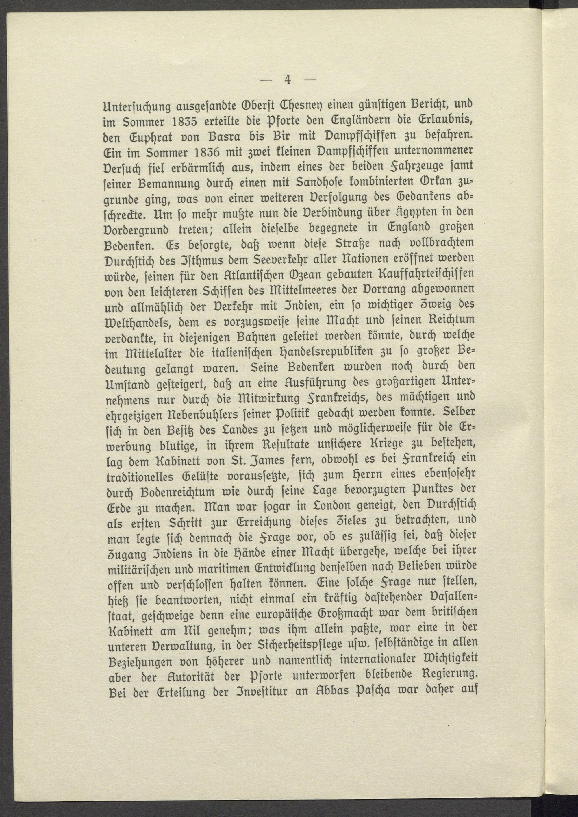 Untersuchung ausgesandte Oberst Chesnen einen günstigen Bericht, und im Sommer 1835 erteilte die Pforte den Engländern die Erlaubnis, den Euphrat von Basra bis Bir mit Dampfschiffen zu befahren. Ein im Sommer 1836 mit zwei kleinen Dampfschiffen unternommener Versuch fiel erbärmlich aus, indem eines der beiden Fahrzeuge samt seiner Bemannung durch einen mit Sandhose kombinierten Orkan zu= grunde ging, was von einer weiteren Verfolgung des Gedankens abschreckte. Um so mehr mußte nun die Verbindung über Ägypten in den Vordergrund treten; allein dieselbe begegnete in England großen Bedenken. Es besorgte, daß wenn diese Straße nach vollbrachtem Durchstich des Isthmus dem Seeverkehr aller Nationen eröffnet werden würde, seinen für den Atlantischen Ozean gebauten Kauffahrteischiffen von den leichteren Schiffen des Mittelmeeres der Vorrang abgewonnen und allmählich der Verkehr mit Indien, ein so wichtiger 3weig des Welthandels, dem es vorzugsweise seine Macht und seinen Reichtum verdankte, in diejenigen Bahnen geleitet werden könnte, durch welche im Mittelalter die italienischen Handelsrepubliken zu so großer Bedeutung gelangt waren. Seine Bedenken wurden noch durch den Umstand gesteigert, daß an eine Ausführung des großartigen Unternehmens nur durch die Mitwirkung Frankreichs, des mächtigen und ehrgeizigen Nebenbuhlers seiner Politik gedacht werden konnte. Selber sich in den Besitz des Landes zu setzen und möglicherweise für die Erwerbung blutige, in ihrem Resultate unsichere Kriege zu bestehen, lag dem Kabinett von St. James fern, obwohl es bei Frankreich ein traditionelles Gelüste voraussetzte, sich zum Herrn eines ebensosehr durch Bodenreichtum wie durch seine Lage bevorzugten Punktes der Erde zu machen. Man war sogar in London geneigt, den Durchstich als ersten Schritt zur Erreichung dieses Zieles zu betrachten, und man legte sich demnach die Frage vor, ob es zulässig sei, daß dieser Zugang Indiens in die Hände einer Macht übergehe, welche bei ihrer militärischen und maritimen Entwicklung denselben nach Belieben würde offen und verschlossen halten können. Eine solche Frage nur stellen, hieß sie beantworten, nicht einmal ein kräftig dastehender Vasallenstaat, geschweige denn eine europäische Großmacht war dem britischen Kabinett am Nil genehm; was ihm allein paßte, war eine in der unteren Verwaltung, in der Sicherheitspflege usw. selbständige in allen Beziehungen von höherer und namentlich internationaler Wichtigkeit aber der Autorität der Pforte unterworfen bleibende Regierung. Bei der Erteilung der Investitur an Abbas Pascha war daher auf