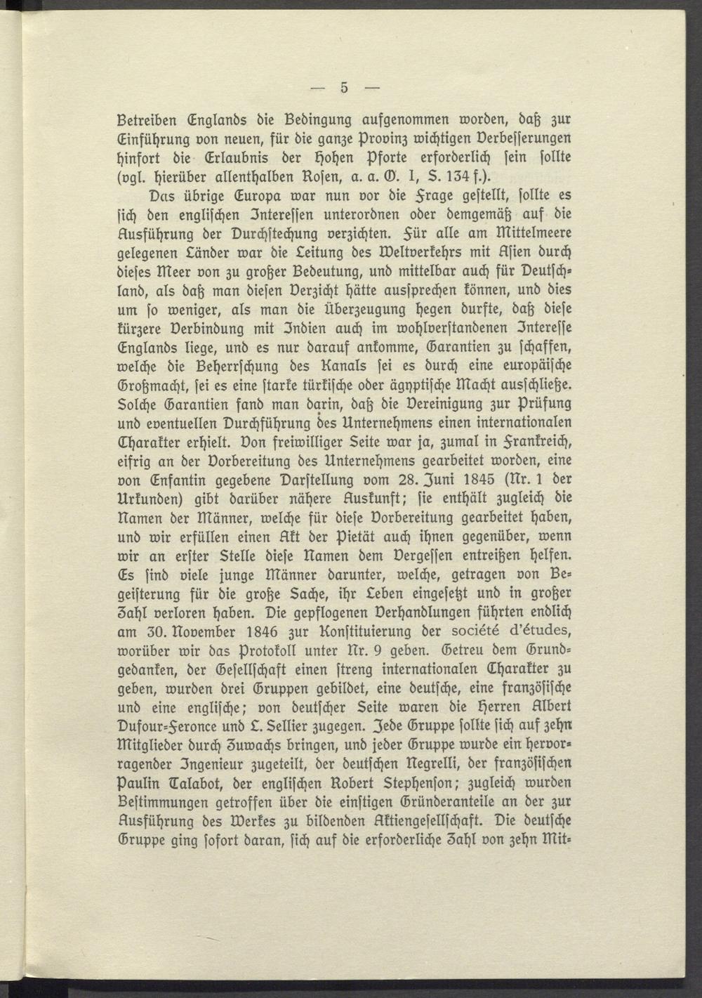 Das übrige Europa war nun vor die Frage gestellt, sollte es sich den englischen Interessen unterordnen oder demgemäß auf die Ausführung der Durchstechung verzichten. Für alle am Mittelmeere gelegenen Länder war die Leitung des Weltverkehrs mit Asien durch dieses Meer von zu großer Bedeutung, und mittelbar auch für Deutschland, als daß man diesen Verzicht hätte aussprechen können, und dies um so weniger, als man die überzeugung hegen durfte, daß diese kürzere Verbindung mit Indien auch im wohlverstandenen Interesse Englands liege, und es nur darauf ankomme, Garantien zu schaffen, welche die Beherrschung des Kanals sei es durch eine europäische Großmacht, sei es eine starke türkische oder ägyptische Macht ausschließe. Solche Garantien fand man darin, daß die Vereinigung zur Prüfung und eventuellen Durchführung des Unternehmens einen internationalen Charakter erhielt. Don freiwilliger Seite war ja, zumal in Frankreich, eifrig an der Vorbereitung des Unternehmens gearbeitet worden, eine von Enfantin gegebene Darstellung vom 28. Juni 1845( nr. 1 der Urkunden) gibt darüber nähere Auskunft; sie enthält zugleich die Namen der Männer, welche für diese Vorbereitung gearbeitet haben, und wir erfüllen einen Akt der Pietät auch ihnen gegenüber, wenn wir an erster Stelle diese Namen dem Vergessen entreißen helfen. Es sind viele junge Männer darunter, welche, getragen von Be= geisterung für die große Sache, ihr Leben eingesetzt und in großer 3ahl verloren haben. Die gepflogenen Verhandlungen führten endlich am 30. November 1846 zur Konstituierung der société d'études, worüber wir das Protokoll unter Nr. 9 geben. Getreu dem Grundgedanken, der Gesellschaft einen streng internationalen Charakter zu geben, wurden drei Gruppen gebildet, eine deutsche, eine französische und eine englische; von deutscher Seite waren die Herren Albert Dufour- Feronce und L. Sellier zugegen. Jede Gruppe sollte sich auf zehn Mitglieder durch Zuwachs bringen, und jeder Gruppe wurde ein hervor= ragender Ingenieur zugeteilt, der deutschen Negrelli, der französischen Paulin Talabot, der englischen Robert Stephenson; zugleich wurden Bestimmungen getroffen über die einstigen Gründeranteile an der zur Ausführung des Werkes zu bildenden Aktiengesellschaft. Die deutsche Gruppe ging sofort daran, sich auf die erforderliche Zahl von zehn Mit