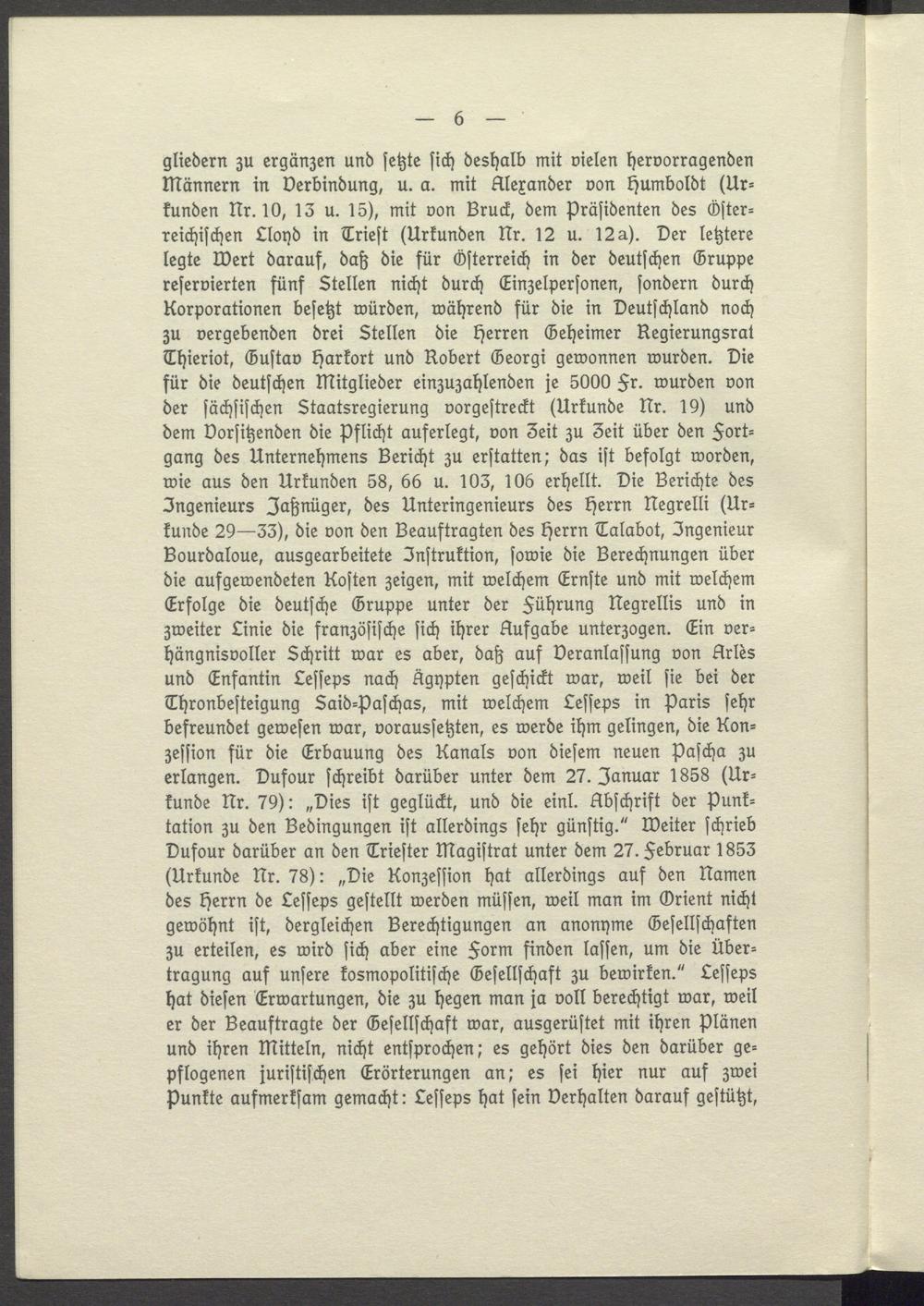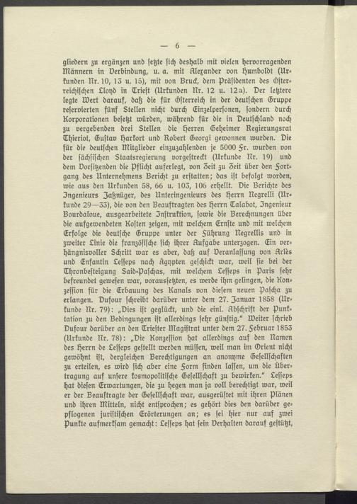 gliedern zu ergänzen und setzte sich deshalb mit vielen hervorragenden Männern in Verbindung, u. a. mit Alexander von Humboldt( Urfunden Nr. 10, 13 u. 15), mit von Bruck, dem Präsidenten des österreichischen Clond in Triest( Urkunden Nr. 12 u. 12a). Der letztere legte Wert darauf, daß die für Österreich in der deutschen Gruppe reservierten fünf Stellen nicht durch Einzelpersonen, sondern durch Korporationen besetzt würden, während für die in Deutschland noch zu vergebenden drei Stellen die Herren Geheimer Regierungsrat Thieriot, Gustav Harkort und Robert Georgi gewonnen wurden. Die für die deutschen Mitglieder einzuzahlenden je 5000 Fr. wurden von der sächsischen Staatsregierung vorgestreckt( Urkunde Nr. 19) und dem Vorsitzenden die Pflicht auferlegt, von Zeit zu Zeit über den Fortgang des Unternehmens Bericht zu erstatten; das ist befolgt worden, wie aus den Urkunden 58, 66 u. 103, 106 erhellt. Die Berichte des Ingenieurs Jaßnüger, des Unteringenieurs des Herrn Negrelli( Urkunde 29-33), die von den Beauftragten des Herrn Talabot, Ingenieur Bourdaloue, ausgearbeitete Instruktion, sowie die Berechnungen über die aufgewendeten Kosten zeigen, mit welchem Ernste und mit welchem Erfolge die deutsche Gruppe unter der Führung Negrellis und in zweiter Linie die französische sich ihrer Aufgabe unterzogen. Ein verhängnisvoller Schritt war es aber, daß auf Veranlassung von Arlès und Enfantin Lesseps nach Ägypten geschickt war, weil sie bei der Thronbesteigung Said- Paschas, mit welchem Lesseps in Paris sehr befreundet gewesen war, voraussetzten, es werde ihm gelingen, die Konzession für die Erbauung des Kanals von diesem neuen Pascha zu erlangen. Dufour schreibt darüber unter dem 27. Januar 1858( Urfunde nr. 79):„ Dies ist geglückt, und die einl. Abschrift der Punktation zu den Bedingungen ist allerdings sehr günstig." Weiter schrieb Dufour darüber an den Triester Magistrat unter dem 27. Februar 1853 ( Urkunde Nr. 78):„ Die Konzession hat allerdings auf den Namen des Herrn de Lesseps gestellt werden müssen, weil man im Orient nicht gewöhnt ist, dergleichen Berechtigungen an anonyme Gesellschaften zu erteilen, es wird sich aber eine Form finden lassen, um die Übertragung auf unsere kosmopolitische Gesellschaft zu bewirken." Lesseps hat diesen Erwartungen, die zu hegen man ja voll berechtigt war, weil er der Beauftragte der Gesellschaft war, ausgerüstet mit ihren Plänen und ihren Mitteln, nicht entsprochen; es gehört dies den darüber ge= pflogenen juristischen Erörterungen an; es sei hier nur auf zwei Punkte aufmerksam gemacht: Lesseps hat sein Verhalten darauf gestützt,