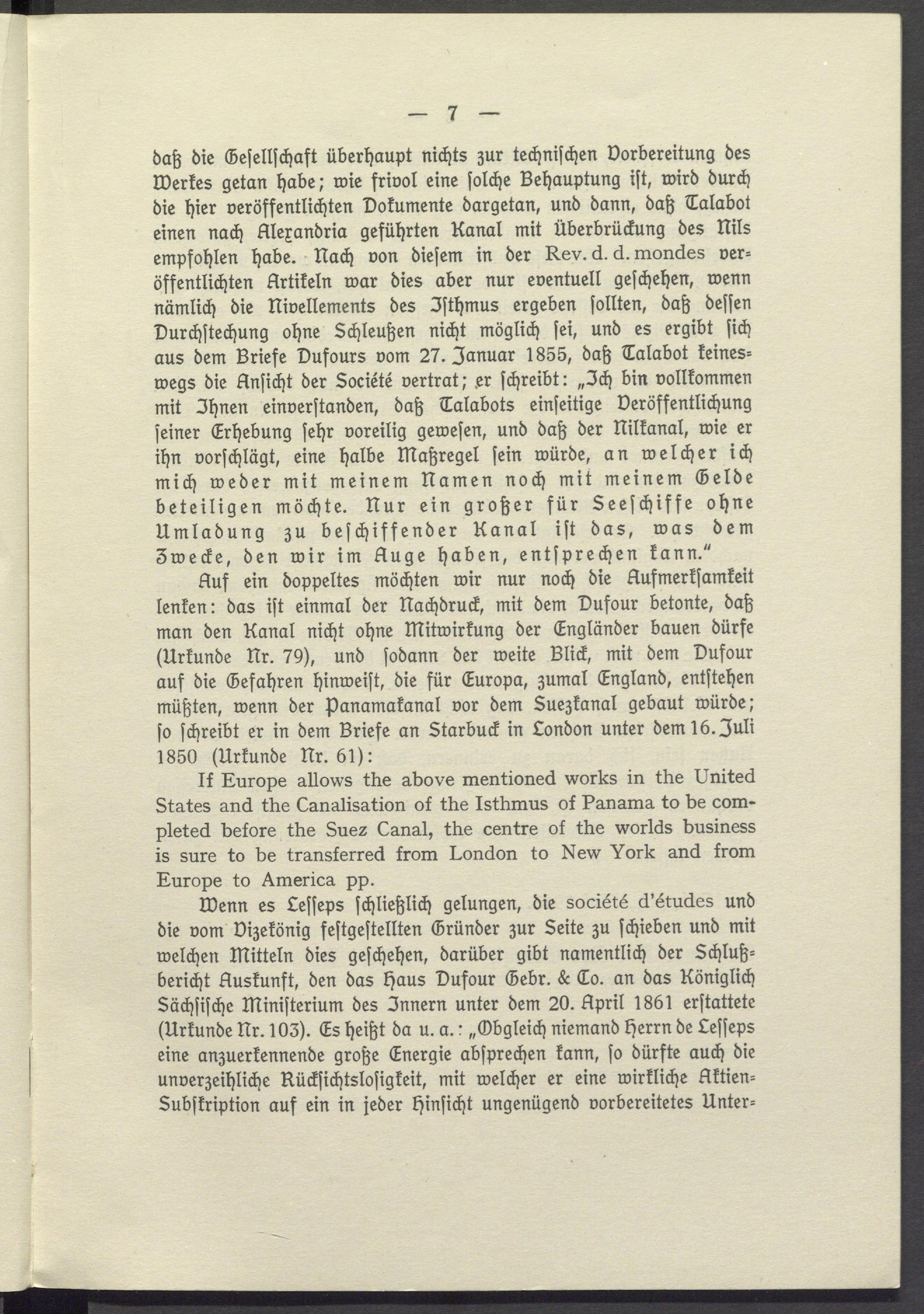Auf ein doppeltes möchten wir nur noch die Aufmerksamkeit lenken: das ist einmal der Nachdruck, mit dem Dufour betonte, daß man den Kanal nicht ohne Mitwirkung der Engländer bauen dürfe ( Urkunde Nr. 79), und sodann der weite Blick, mit dem Dufour auf die Gefahren hinweist, die für Europa, zumal England, entstehen müßten, wenn der Panamakanal vor dem Suezkanal gebaut würde; so schreibt er in dem Briefe an Starbuck in London unter dem 16. Juli 1850( Urkunde Nr. 61):
