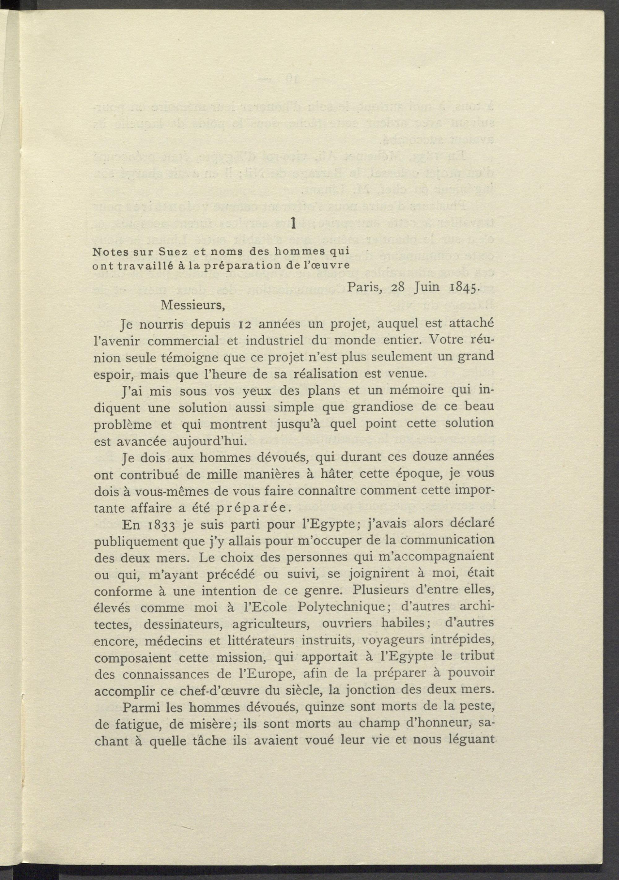 En 1833 je suis parti pour l'Egypte; j'avais alors déclaré publiquement que j'y allais pour m'occuper de la communication des deux mers. Le choix des personnes qui m'accompagnaient ou qui, m'ayant précédé ou suivi, se joignirent à moi, était conforme à une intention de ce genre. Plusieurs d'entre elles, élevés comme moi à l'Ecole Polytechnique; d'autres architectes, dessinateurs, agriculteurs, ouvriers habiles; d'autres encore, médecins et littérateurs instruits, voyageurs intrépides, composaient cette mission, qui apportait à l'Egypte le tribut des connaissances de l'Europe, afin de la préparer à pouvoir accomplir ce chef- d'œuvre du siècle, la jonction des deux mers. Parmi les hommes dévoués, quinze sont morts de la peste, de fatigue, de misère; ils sont morts au champ d'honneur, sachant à quelle tâche ils avaient voué leur vie et nous léguant