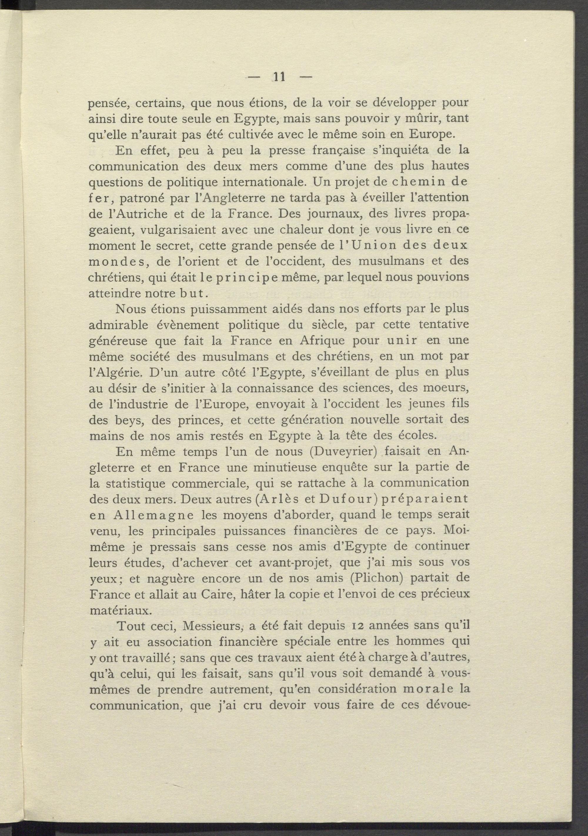 En effet, peu à peu la presse française s'inquiéta de la communication des deux mers comme d'une des plus hautes questions de politique internationale. Un projet de chemin de fer, patroné par l'Angleterre ne tarda pas à éveiller l'attention de l'Autriche et de la France. Des journaux, des livres propageaient, vulgarisaient avec une chaleur dont je vous livre en ce moment le secret, cette grande pensée de l'Union des deux mondes, de l'orient et de l'occident, des musulmans et des chrétiens, qui était le principe même, par lequel nous pouvions atteindre notre but.