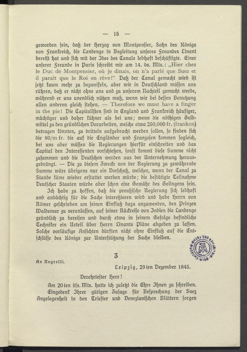geworden sein, daß der Herzog von Montpensier, Sohn des Königs von Frankreich, die Landenge in Begleitung unseres Freundes Linant bereist hat und sich mit der Idee des Canals lebhaft beschäftigte. Einer unserer Freunde in Paris schreibt mir am 14. ds. mts.:,,Hier chez le Duc de Montpensier, où je dinais, on n'a parlé que Suez et il paraît que le Roi en rève!" Daß der Canal gemacht wird ist jetzt kaum mehr zu bezweifeln, aber wir in Deutschland müssen uns rühren, daß er nicht ohne uns und zu unserem Nachteil gemacht werde, während er uns unendlich nühen muß, wenn wir bei dessen Benutzung allen anderen gleich stehen. Therefore we must have a finger in the pie! Die Capitalisten sind in England und Frankreich häufiger, mächtiger und daher kühner als bei uns; wenn die nöthigen Geldmittel zu den gründlichen Vorarbeiten, welche etwa 250,000 fr.( franken) betragen könnten, zu dritteln aufgebracht werden sollen, so finden sich die 80/ m fr. die auf die Engländer und Franzosen kommen sogleich, bei uns aber müssen die Regierungen hierfür einschreiten und das Capital den Interessenten vorschießen, sonst kommt diese Summe nicht zusammen und die Deutschen werden aus der Unternehmung herausgedrängt. Die zu diesem Zwecke von der Regierung zu gewährende Summe wäre übrigens nur ein Vorschuß, welcher, wenn der Tanal zu Stande käme wieder erstattet werden würde; die bestätigte Teilnahme Deutscher Staaten würde aber schon eine Gewähr des Gelingens sein.