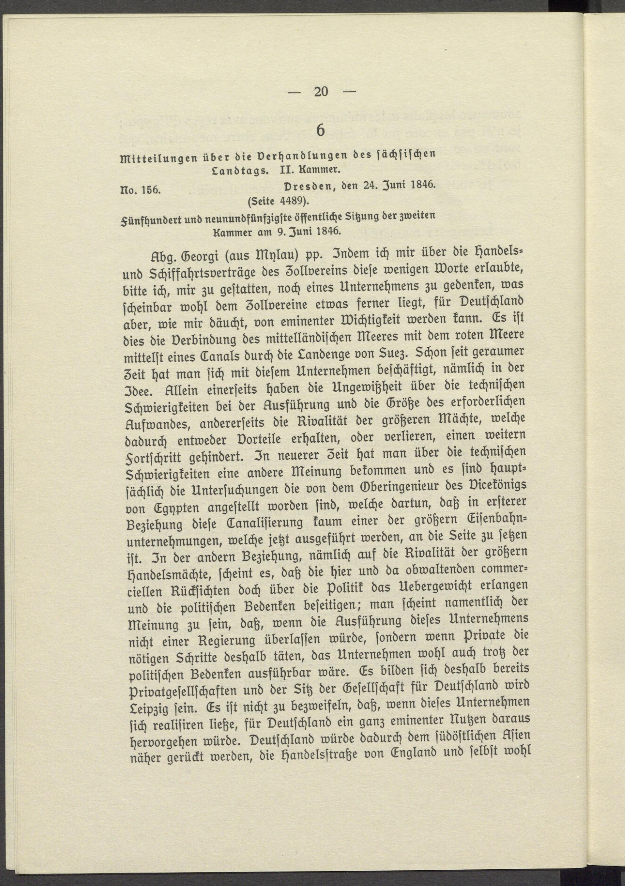 Abg. Georgi( aus Mylau) pp. Indem ich mir über die Handelsund Schiffahrtsverträge des 3ollvereins diese wenigen Worte erlaubte, bitte ich, mir zu gestatten, noch eines Unternehmens zu gedenken, was scheinbar wohl dem 3ollvereine etwas ferner liegt, für Deutschland aber, wie mir däucht, von eminenter Wichtigkeit werden kann. Es ist dies die Verbindung des mittelländischen Meeres mit dem roten Meere mittelst eines Canals durch die Landenge von Suez. Schon seit geraumer Zeit hat man sich mit diesem Unternehmen beschäftigt, nämlich in der Jdee. Allein einerseits haben die Ungewißheit über die techniſchen Schwierigkeiten bei der Ausführung und die Größe des erforderlichen Aufwandes, andererseits die Rivalität der größeren Mächte, welche dadurch entweder Vorteile erhalten, oder verlieren, einen weitern Fortschritt gehindert. In neuerer 3eit hat man über die technischen Schwierigkeiten eine andere Meinung bekommen und es sind hauptsächlich die Untersuchungen die von dem Oberingenieur des Dicekönigs von Egypten angestellt worden sind, welche dartun, daß in ersterer Beziehung diese Canalisierung kaum einer der größern Eisenbahnunternehmungen, welche jetzt ausgeführt werden, an die Seite zu setzen ist. In der andern Beziehung, nämlich auf die Rivalität der größern Handelsmächte, scheint es, daß die hier und da obwaltenden commer= ciellen Rücksichten doch über die Politik das Uebergewicht erlangen und die politischen Bedenken beseitigen; man scheint namentlich der Meinung zu sein, daß, wenn die Ausführung dieses Unternehmens nicht einer Regierung überlassen würde, sondern wenn Private die nötigen Schritte deshalb täten, das Unternehmen wohl auch trotz der politischen Bedenken ausführbar wäre. Es bilden sich deshalb bereits Privatgesellschaften und der Sitz der Gesellschaft für Deutschland wird Leipzig sein. Es ist nicht zu bezweifeln, daß, wenn dieses Unternehmen sich realisiren ließe, für Deutschland ein ganz eminenter Nutzen daraus hervorgehen würde. Deutschland würde dadurch dem südöstlichen Asien näher gerückt werden, die Handelsstraße von England und selbst wohl