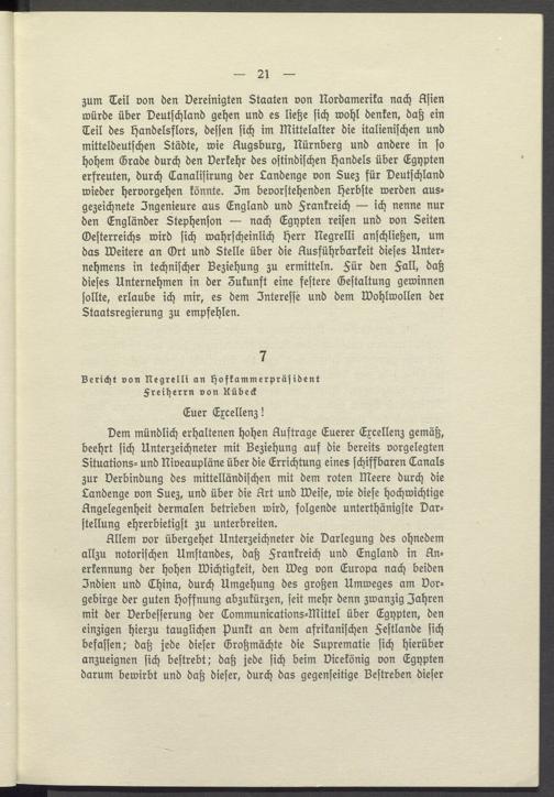 Dem mündlich erhaltenen hohen Auftrage Euerer Excellenz gemäß, beehrt sich Unterzeichneter mit Beziehung auf die bereits vorgelegten Situations- und Niveaupläne über die Errichtung eines schiffbaren Canals zur Derbindung des mittelländischen mit dem roten Meere durch die Landenge von Suez, und über die Art und Weise, wie diese hochwichtige Angelegenheit dermalen betrieben wird, folgende unterthänigste Darstellung ehrerbietigst zu unterbreiten.