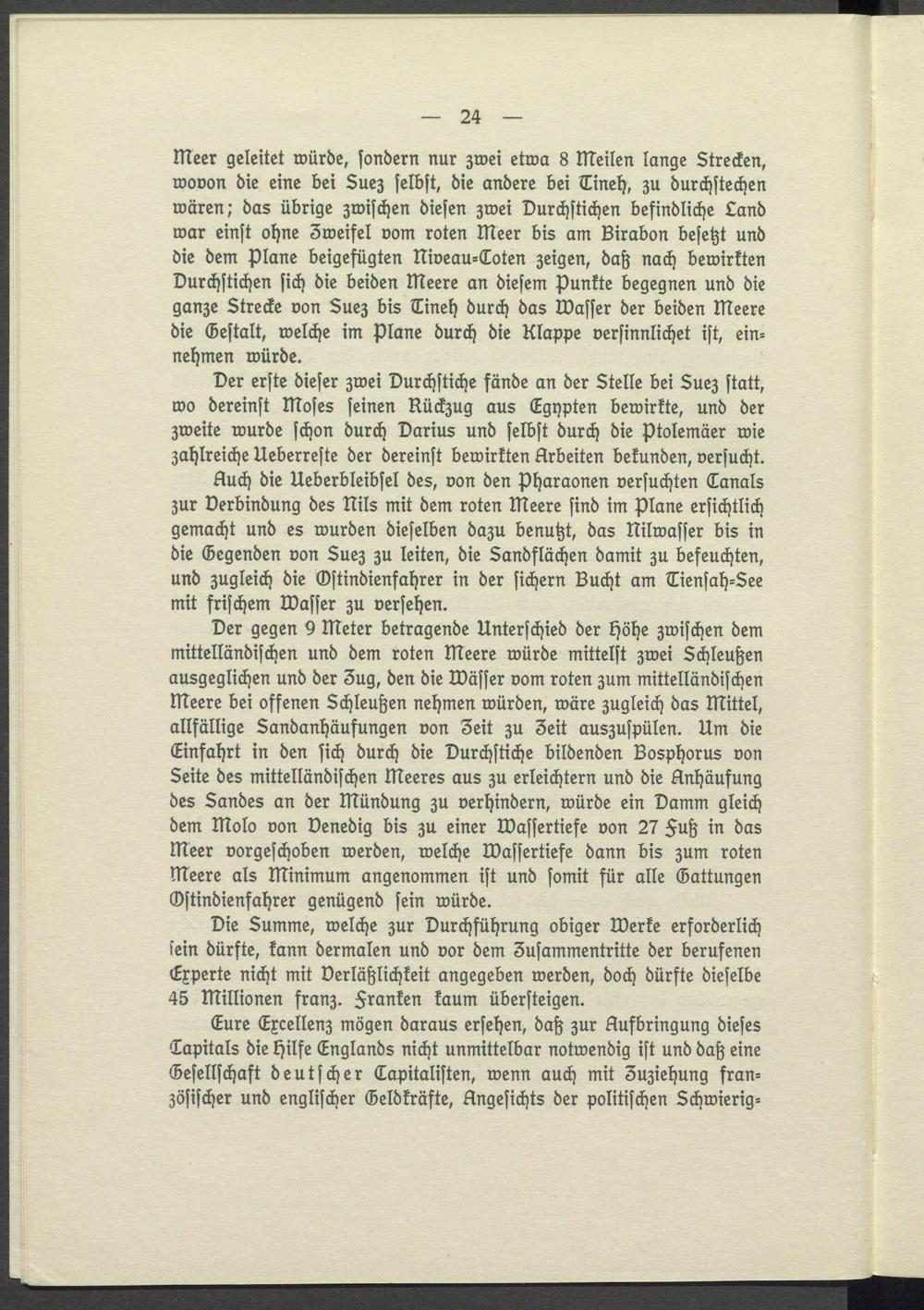 Der erste dieser zwei Durchstiche fände an der Stelle bei Suez statt, wo dereinst Moses seinen Rückzug aus Egypten bewirkte, und der zweite wurde schon durch Darius und selbst durch die Ptolemäer wie zahlreiche Ueberreste der dereinst bewirkten Arbeiten bekunden, versucht.
