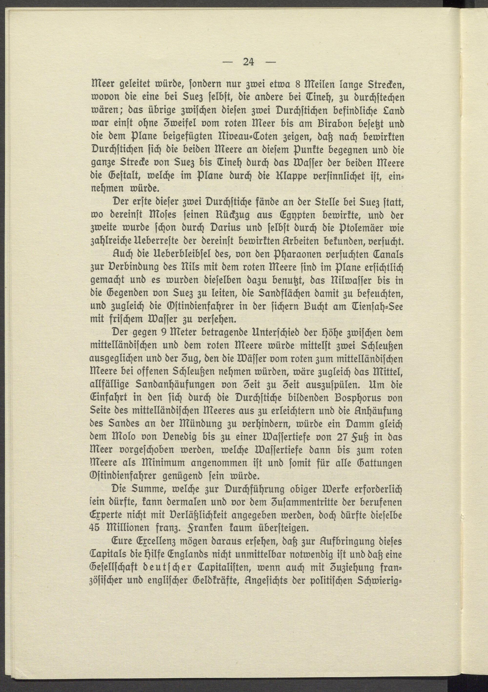 Meer geleitet würde, sondern nur zwei etwa 8 Meilen lange Strecken, wovon die eine bei Suez selbst, die andere bei Tineh, zu durchstechen wären; das übrige zwischen diesen zwei Durchstichen befindliche Land war einst ohne Zweifel vom roten meer bis am Birabon besetzt und die dem Plane beigefügten Niveau- Coten zeigen, daß nach bewirkten Durchstichen sich die beiden Meere an diesem Punkte begegnen und die ganze Strecke von Suez bis Tineh durch das Wasser der beiden Meere die Gestalt, welche im Plane durch die Klappe versinnlichet ist, einnehmen würde.