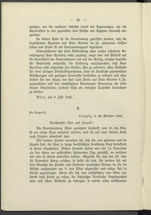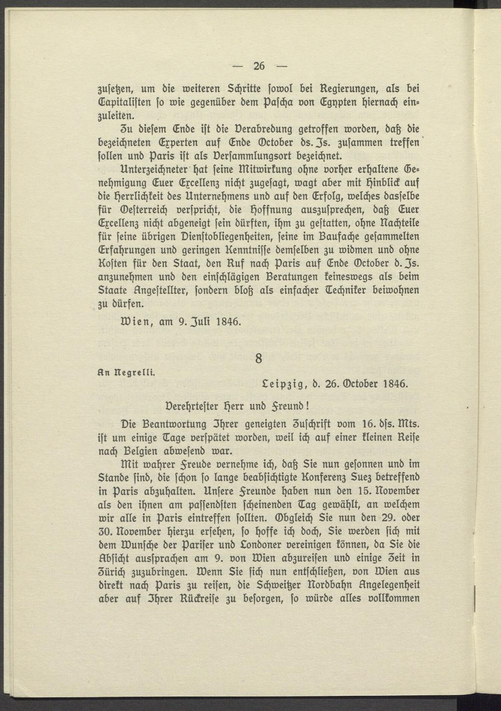 mit wahrer Freude vernehme ich, daß Sie nun gesonnen und im Stande sind, die schon so lange beabsichtigte Konferenz Suez betreffend in Paris abzuhalten. Unsere Freunde haben nun den 15. November als den ihnen am passendsten scheinenden Tag gewählt, an welchem wir alle in Paris eintreffen sollten. Obgleich Sie nun den 29. oder 30. November hierzu ersehen, so hoffe ich doch, Sie werden sich mit dem Wunsche der Pariser und Londoner vereinigen können, da Sie die Absicht aussprachen am 9. von Wien abzureisen und einige 3eit in Zürich zuzubringen. Wenn Sie sich nun entschließen, von Wien aus direkt nach Paris zu reisen, die Schweitzer Nordbahn Angelegenheit aber auf Ihrer Rückreise zu besorgen, so würde alles vollkommen