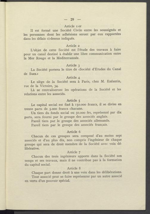 L'objet de cette Société est l'étude des travaux à faire pour un canal destiné à établir une libre communication entre la Mer Rouge et la Mediterrannée.
