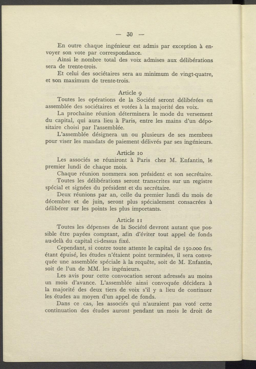 Cependant, si contre toute attente le capital de 150.000 frs. étant épuisé, les études n'étaient point terminées, il sera convoquée une assemblée spéciale à la requête, soit de M. Enfantin, soit de l'un de MM. les ingénieurs.
