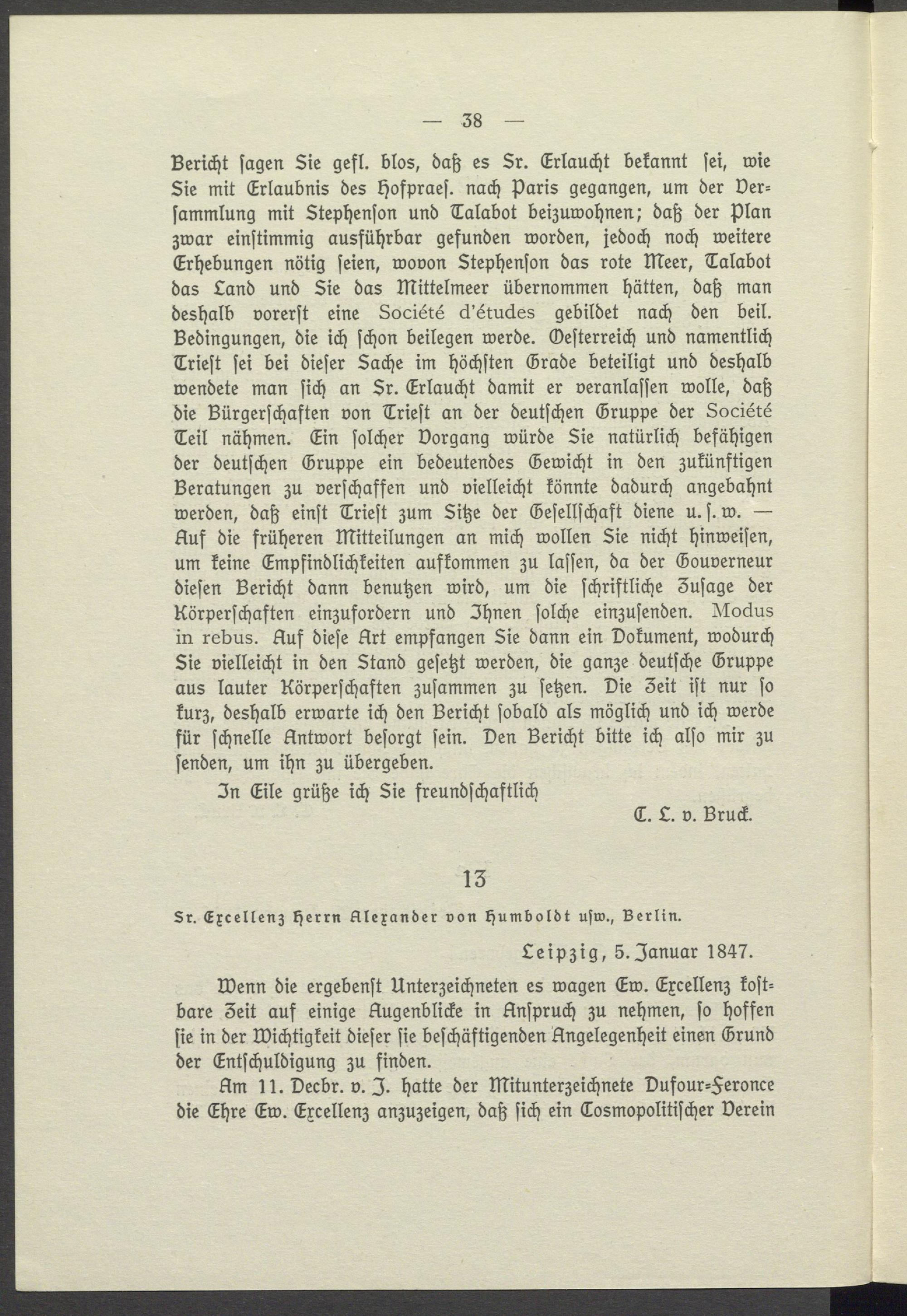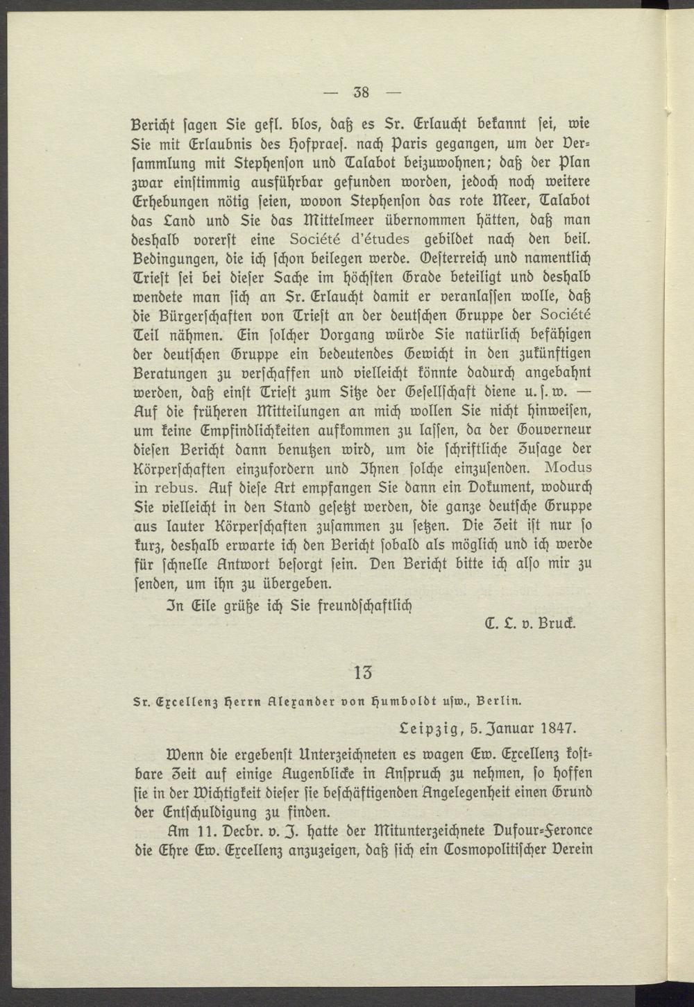 Bericht sagen Sie gefl. blos, daß es Sr. Erlaucht bekannt sei, wie Sie mit Erlaubnis des Hofpraes. nach Paris gegangen, um der Ver= sammlung mit Stephenson und Talabot beizuwohnen; daß der Plan zwar einstimmig ausführbar gefunden worden, jedoch noch weitere Erhebungen nötig seien, wovon Stephenson das rote meer, Talabot das Land und Sie das Mittelmeer übernommen hätten, daß man deshalb vorerst eine Société d'études gebildet nach den beil. Bedingungen, die ich schon beilegen werde. Oesterreich und namentlich Triest sei bei dieser Sache im höchsten Grade beteiligt und deshalb wendete man sich an Sr. Erlaucht damit er veranlassen wolle, daß die Bürgerschaften von Triest an der deutschen Gruppe der Société Teil nähmen. Ein solcher Vorgang würde Sie natürlich befähigen der deutschen Gruppe ein bedeutendes Gewicht in den zukünftigen Beratungen zu verschaffen und vielleicht könnte dadurch angebahnt werden, daß einst Triest zum Sitze der Gesellschaft diene u. s. w. Auf die früheren Mitteilungen an mich wollen Sie nicht hinweisen, um keine Empfindlichkeiten aufkommen zu lassen, da der Gouverneur diesen Bericht dann benutzen wird, um die schriftliche Zusage der Körperschaften einzufordern und Ihnen solche einzusenden. Modus in rebus. Auf diese Art empfangen Sie dann ein Dokument, wodurch Sie vielleicht in den Stand gesetzt werden, die ganze deutsche Gruppe aus lauter Körperschaften zusammen zu setzen. Die 3eit ist nur so kurz, deshalb erwarte ich den Bericht sobald als möglich und ich werde für schnelle Antwort besorgt sein. Den Bericht bitte ich also mir zu senden, um ihn zu übergeben.