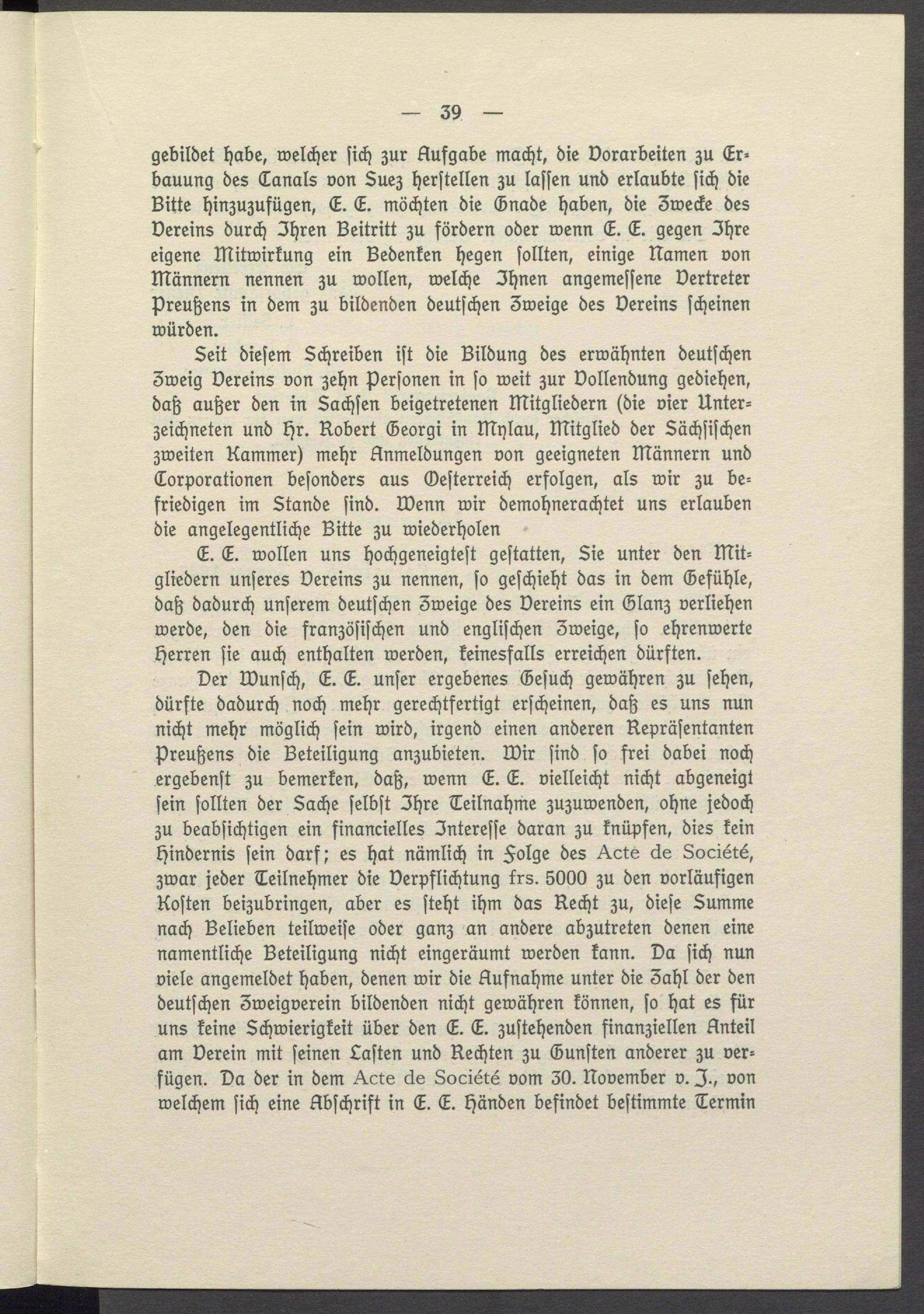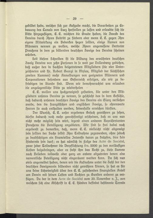 gebildet habe, welcher sich zur Aufgabe macht, die Vorarbeiten zu Erbauung des Canals von Suez herstellen zu lassen und erlaubte sich die Bitte hinzuzufügen, E. E. möchten die Gnade haben, die Zwecke des Vereins durch Ihren Beitritt zu fördern oder wenn E. E. gegen Ihre eigene Mitwirkung ein Bedenken hegen sollten, einige Namen von Männern nennen zu wollen, welche Ihnen angemessene Vertreter Preußens in dem zu bildenden deutschen Zweige des Vereins scheinen würden.