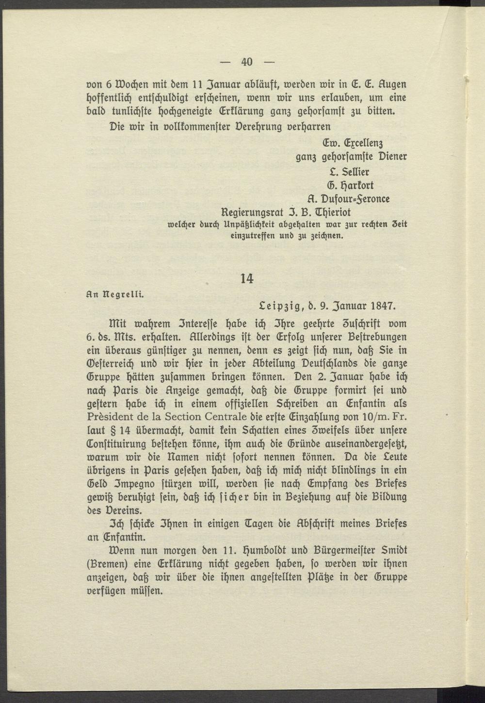 Mit wahrem Interesse habe ich Ihre geehrte Zuschrift vom 6. ds. Mts. erhalten. Allerdings ist der Erfolg unserer Bestrebungen ein überaus günstiger zu nennen, denn es zeigt sich nun, daß Sie in Oesterreich und wir hier in jeder Abteilung Deutschlands die ganze Gruppe hätten zusammen bringen können. Den 2. Januar habe ich nach Paris die Anzeige gemacht, daß die Gruppe formirt sei und gestern habe ich in einem offiziellen Schreiben an Enfantin als Prèsident de la Section Centrale die erste Einzahlung von 10/ m. Fr. laut§ 14 übermacht, damit kein Schatten eines 3weifels über unsere Constituirung bestehen könne, ihm auch die Gründe auseinandergesetzt, warum wir die Namen nicht sofort nennen können. Da die Leute übrigens in Paris gesehen haben, daß ich mich nicht blindlings in ein Geld Impegno stürzen will, werden sie nach Empfang des Briefes gewiß beruhigt sein, daß ich sicher bin in Beziehung auf die Bildung des Dereins.