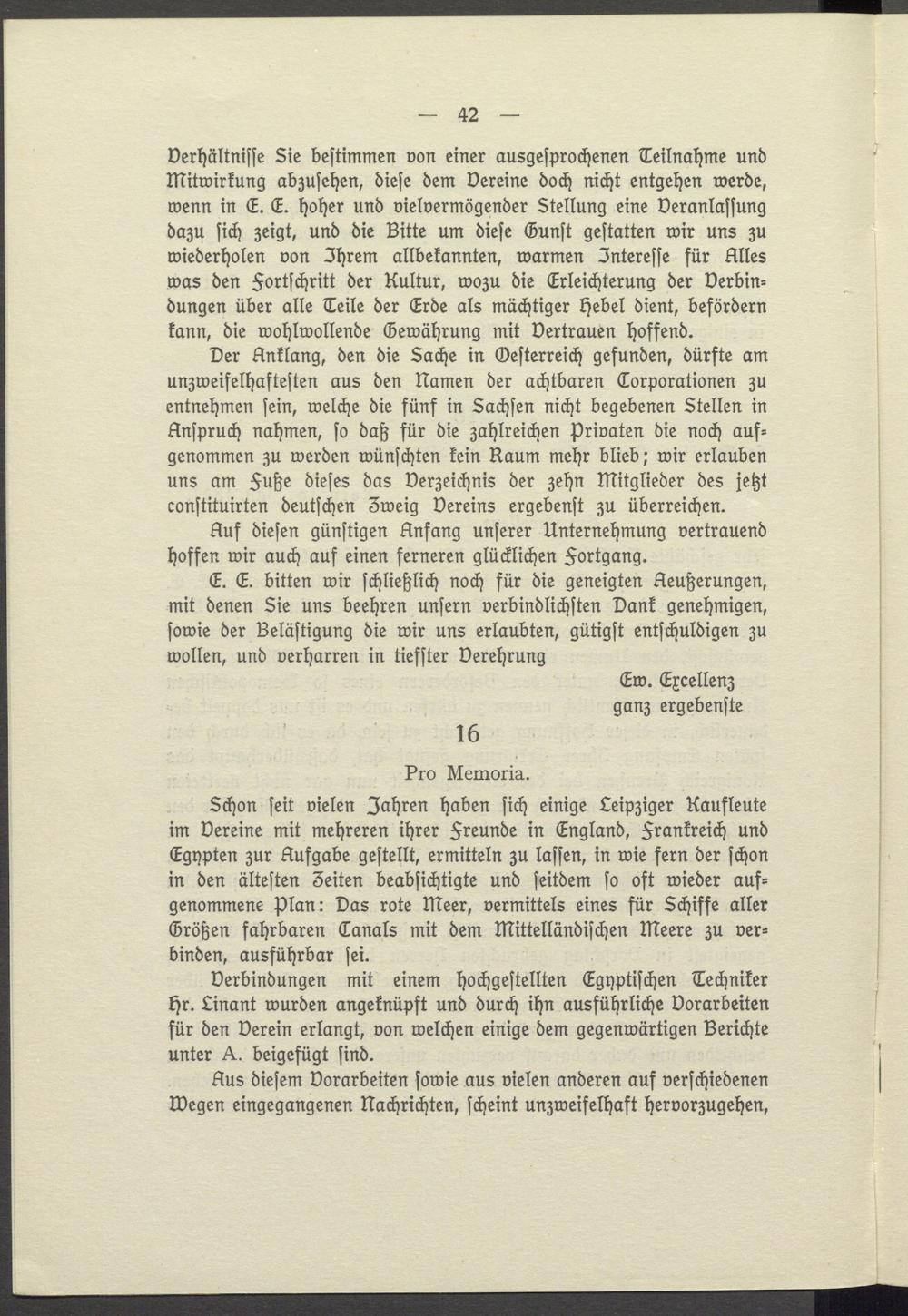 Verbindungen mit einem hochgestellten Egyptischen Techniker Hr. Linant wurden angeknüpft und durch ihn ausführliche Vorarbeiten für den Verein erlangt, von welchen einige dem gegenwärtigen Berichte unter A. beigefügt sind.