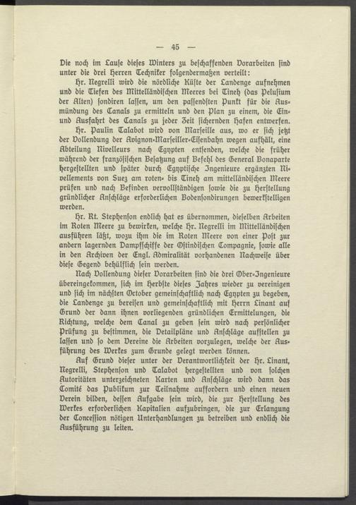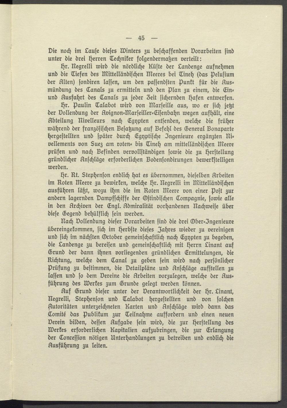 Auf Grund dieser unter der Verantwortlichkeit der Hr. Linant, Negrelli, Stephenson und Talabot hergestellten und von solchen Autoritäten unterzeichneten Karten und Anschläge wird dann das Comité das Publikum zur Teilnahme auffordern und einen neuen Derein bilden, dessen Aufgabe sein wird, die zur Herstellung des Werkes erforderlichen Kapitalien aufzubringen, die zur Erlangung der Concession nötigen Unterhandlungen zu betreiben und endlich die Ausführung zu leiten.