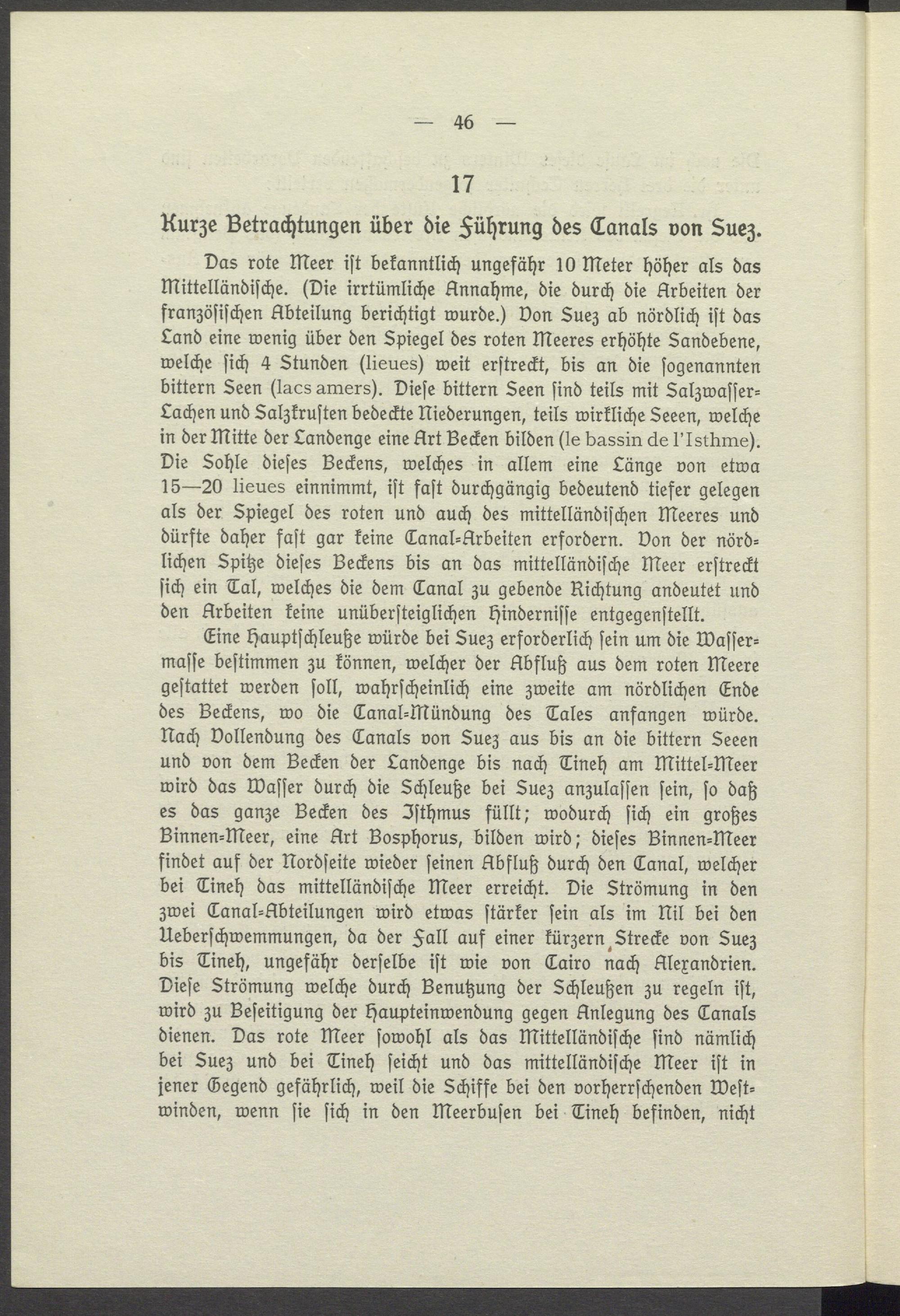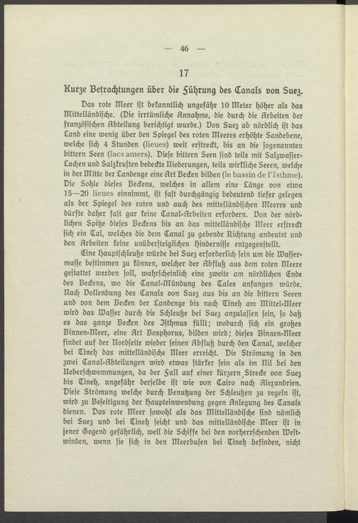 Kurze Betrachtungen über die Führung des Canals von Suez. Das rote meer ist bekanntlich ungefähr 10 meter höher als das Mittelländische.( Die irrtümliche Annahme, die durch die Arbeiten der französischen Abteilung berichtigt wurde.) Don Suez ab nördlich ist das Land eine wenig über den Spiegel des roten Meeres erhöhte Sandebene, welche sich 4 Stunden( lieues) weit erstreckt, bis an die sogenannten bittern Seen( lacs amers). Diese bittern Seen sind teils mit SalzwasserLachen und Salzkrusten bedeckte Niederungen, teils wirkliche Seeen, welche in der Mitte der Landenge eine Art Becken bilden( le bassin de l'Isthme). Die Sohle dieses Beckens, welches in allem eine Länge von etwa 15-20 lieues einnimmt, ist fast durchgängig bedeutend tiefer gelegen als der Spiegel des roten und auch des mittelländischen Meeres und dürfte daher fast gar keine Canal- Arbeiten erfordern. Von der nördlichen Spitze dieses Beckens bis an das mittelländische Meer erstreckt sich ein Tal, welches die dem Canal zu gebende Richtung andeutet und den Arbeiten keine unübersteiglichen Hindernisse entgegenstellt.