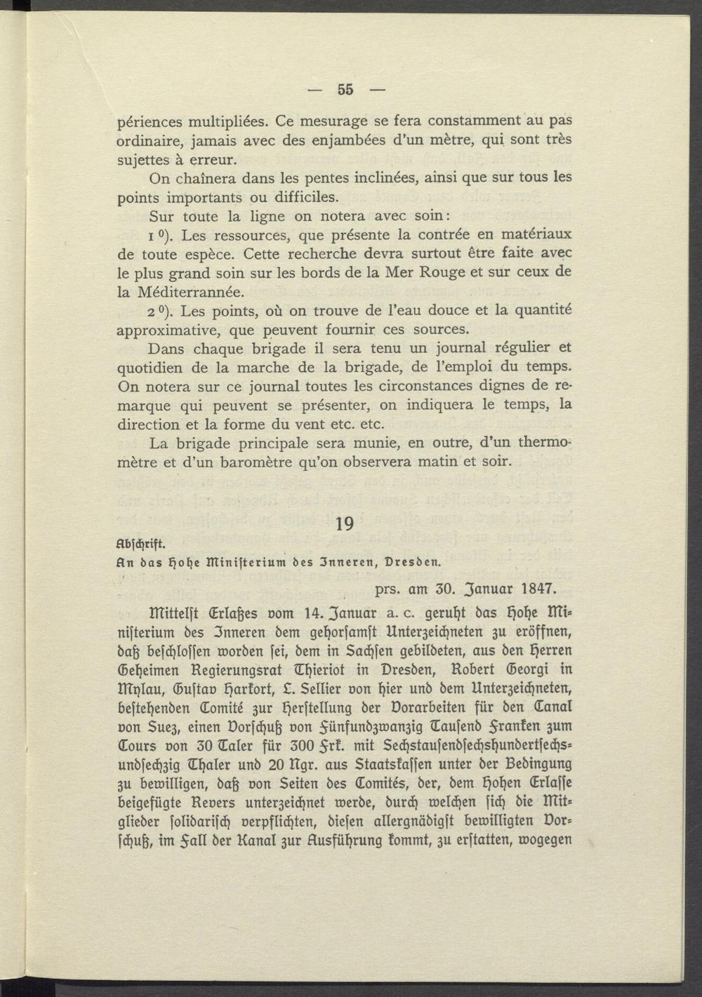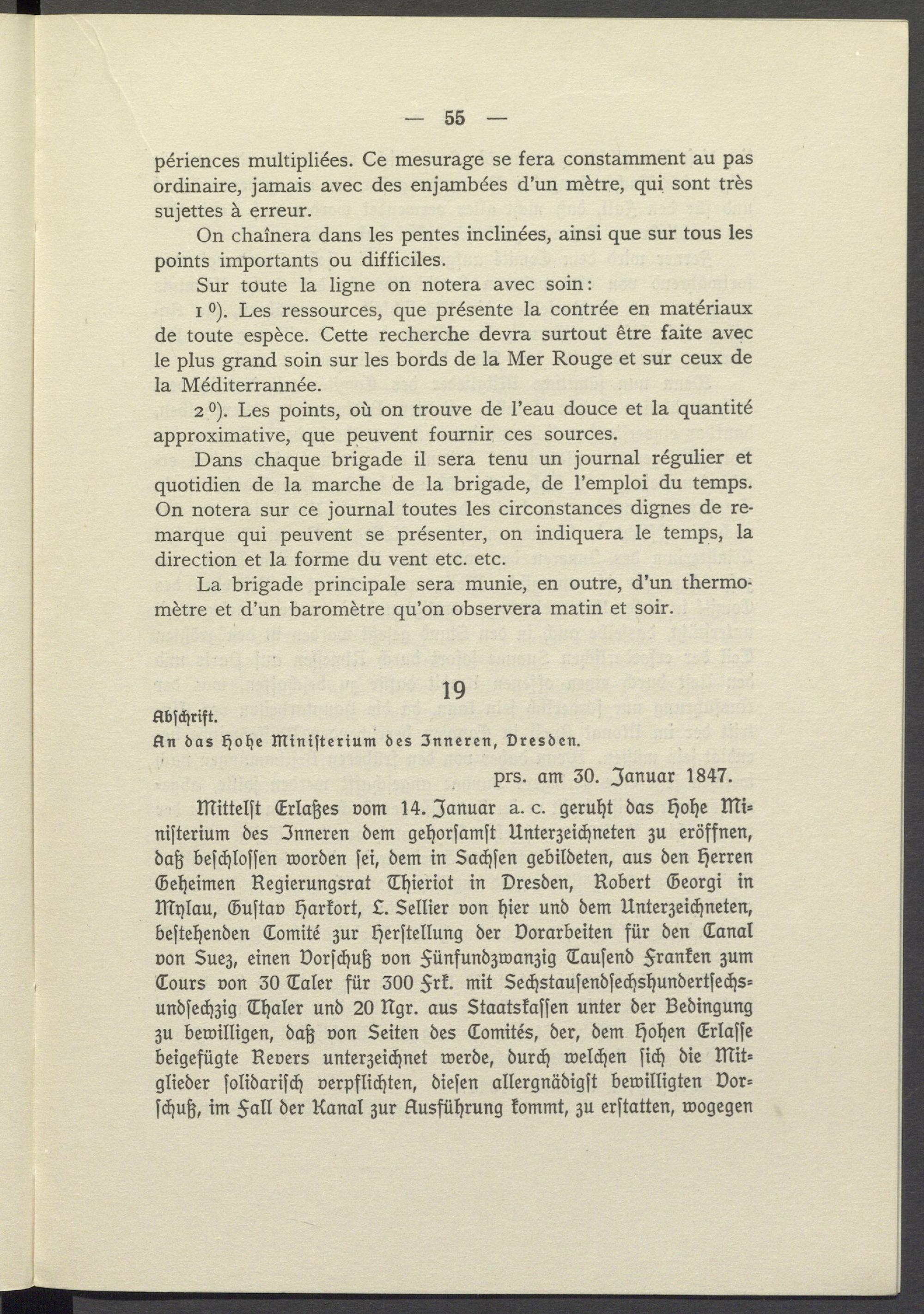 Mittelst Erlaßes vom 14. Januar a. c. geruht das hohe ministerium des Inneren dem gehorsamst Unterzeichneten zu eröffnen, daß beschlossen worden sei, dem in Sachsen gebildeten, aus den Herren Geheimen Regierungsrat Thieriot in Dresden, Robert Georgi in Mylau, Gustav Harkort, L. Sellier von hier und dem Unterzeichneten, bestehenden Comité zur Herstellung der Vorarbeiten für den Canal von Suez, einen Vorschuß von Fünfundzwanzig Tausend Franken zum Tours von 30 Taler für 300 Frk. mit Sechstausendsechshundertsechs= undsechzig Thaler und 20 Ngr. aus Staatskassen unter der Bedingung zu bewilligen, daß von Seiten des Comités, der, dem Hohen Erlasse beigefügte Revers unterzeichnet werde, durch welchen sich die Mitglieder solidarisch verpflichten, diesen allergnädigst bewilligten Vorschuß, im Fall der Kanal zur Ausführung kommt, zu erstatten, wogegen