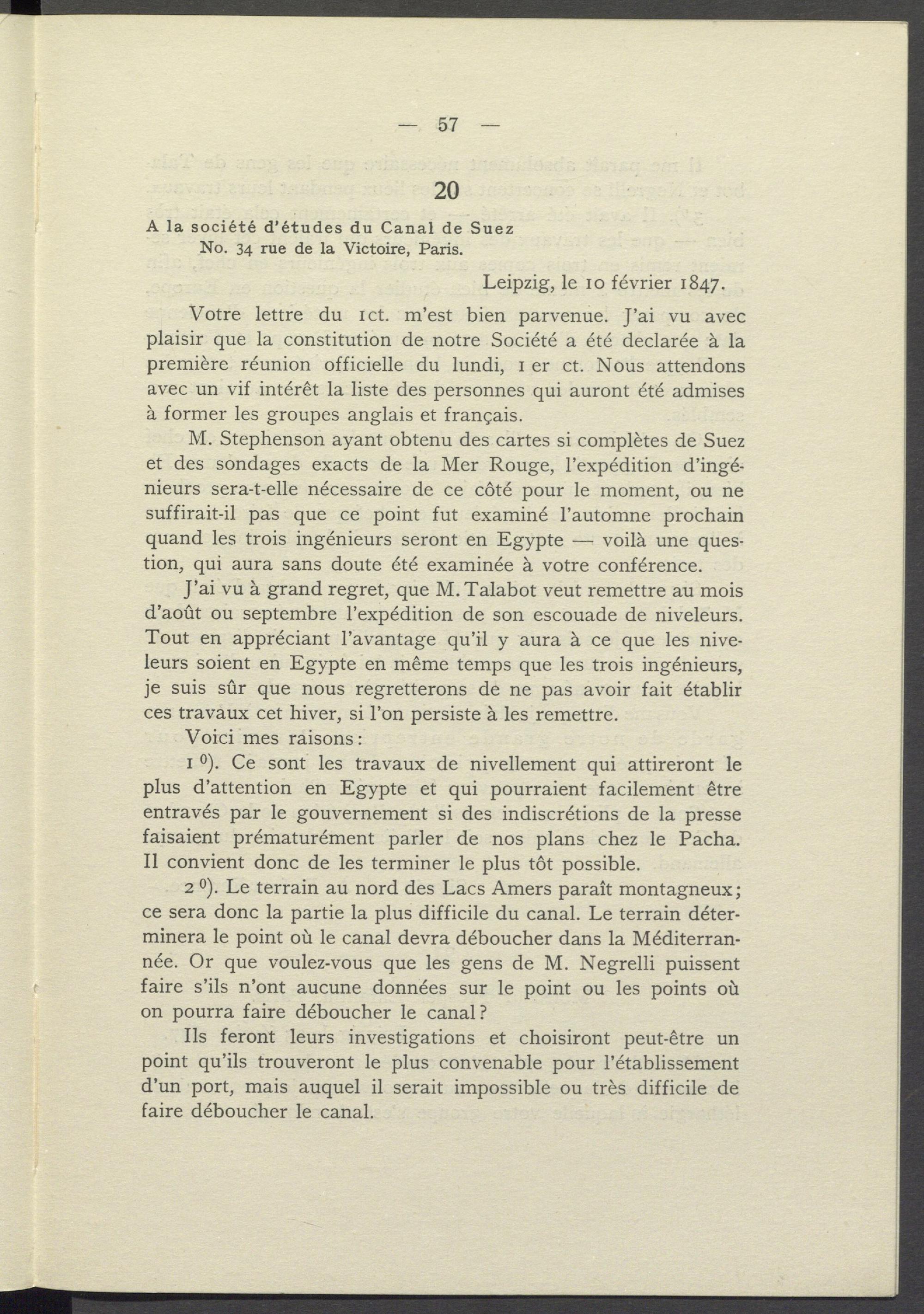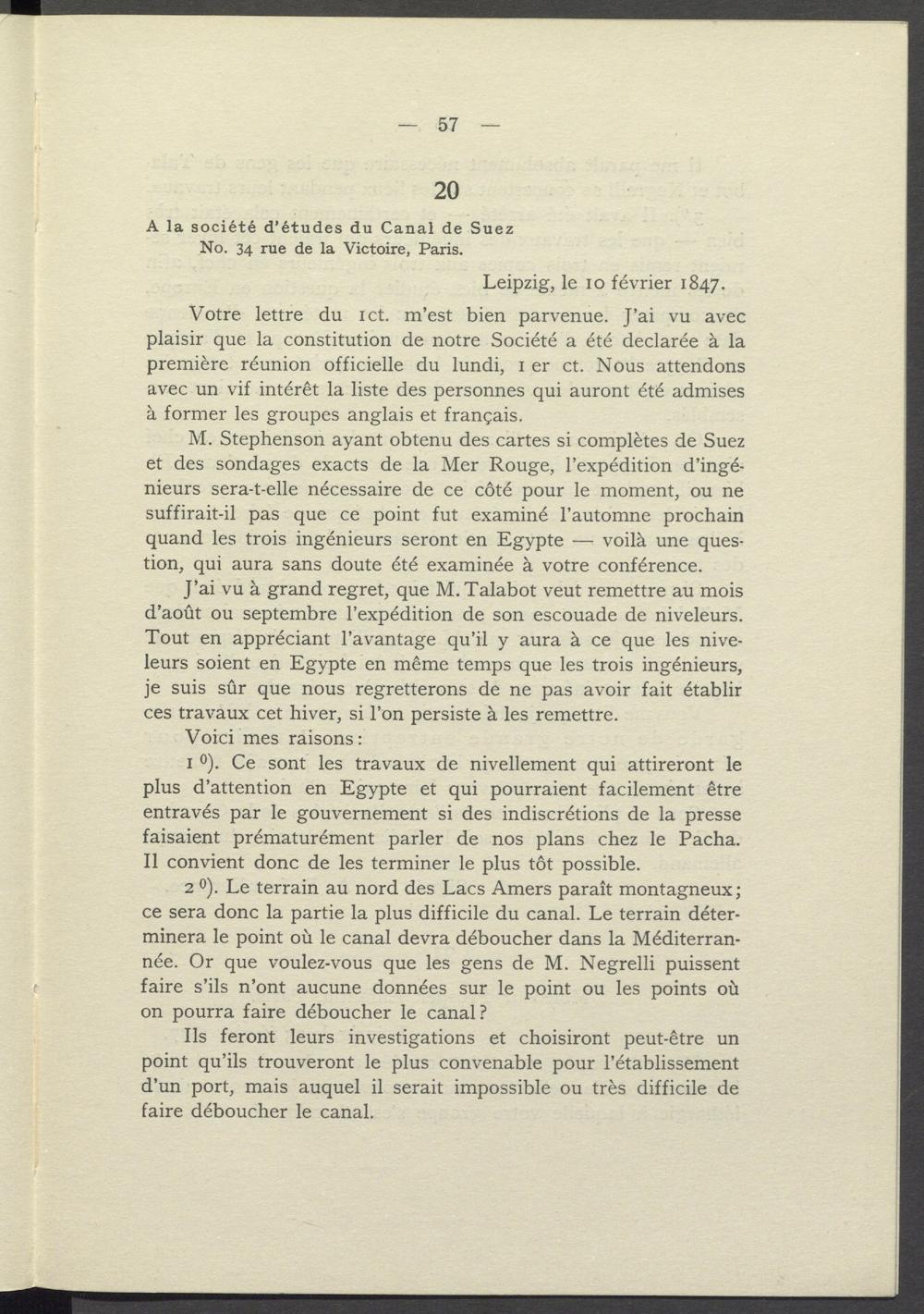 20). Le terrain au nord des Lacs Amers paraît montagneux; ce sera donc la partie la plus difficile du canal. Le terrain déterminera le point où le canal devra déboucher dans la Méditerrannée. Or que voulez- vous que les gens de M. Negrelli puissent faire s'ils n'ont aucune données sur le point ou les points où on pourra faire déboucher le canal?