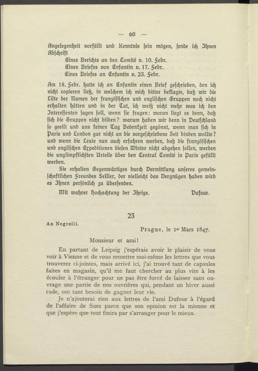 Am 18. Febr. hatte ich an Enfantin einen Brief geschrieben, den ich nicht copieren ließ, in welchem ich mich bitter beklagte, daß wir die Liste der Namen der französischen und englischen Gruppen noch nicht erhalten hätten und in der Tat, ich weiß nicht mehr was ich den Interessenten sagen soll, wenn sie fragen: woran liegt es denn, daß sich die Gruppen nicht bilden? warum haben wir denn in Deutschland so geeilt und uns keinen Tag Bedenkzeit gegönnt, wenn man sich in Paris und London gar nicht an die vorgeschriebene 3eit binden wollte? und wenn die Leute nun auch erfahren werden, daß die französischen und englischen Expeditionen diesen Winter nicht abgehen sollen, werden die unglimpflichsten Urteile über den Central Comité in Paris gefällt werden.