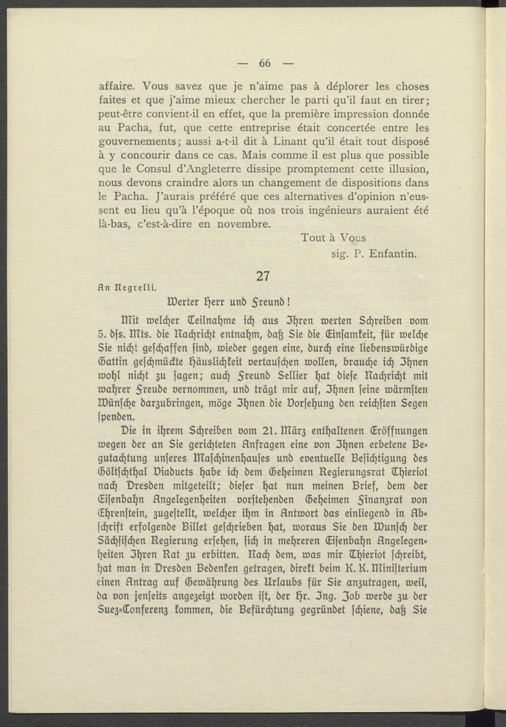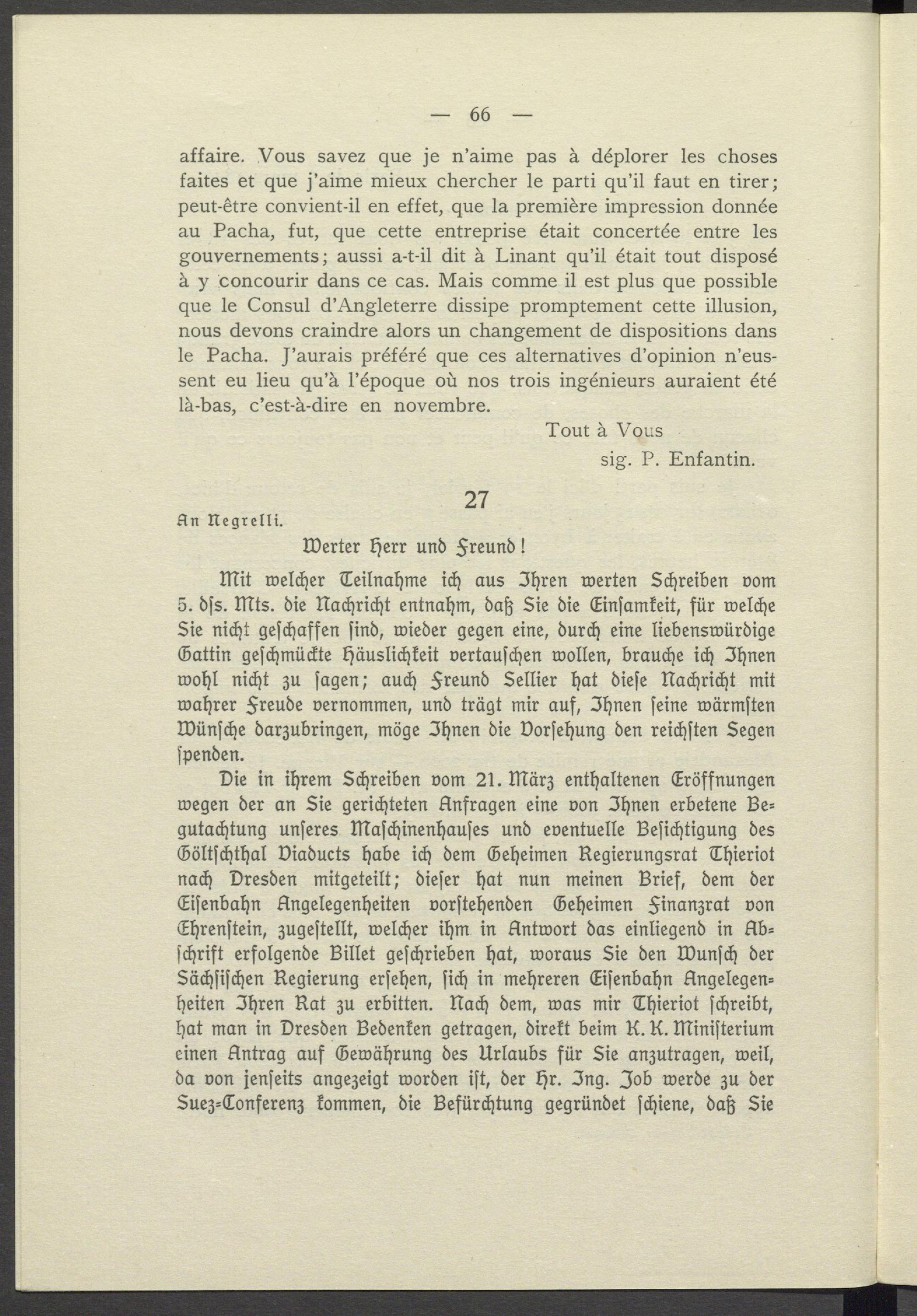 Die in ihrem Schreiben vom 21. März enthaltenen Eröffnungen wegen der an Sie gerichteten Anfragen eine von Ihnen erbetene Begutachtung unseres Maschinenhauses und eventuelle Besichtigung des Göltschthal Viaducts habe ich dem Geheimen Regierungsrat Thieriot nach Dresden mitgeteilt; dieser hat nun meinen Brief, dem der Eisenbahn Angelegenheiten vorstehenden Geheimen Finanzrat von Ehrenstein, zugestellt, welcher ihm in Antwort das einliegend in Abschrift erfolgende Billet geschrieben hat, woraus Sie den Wunsch der Sächsischen Regierung ersehen, sich in mehreren Eisenbahn Angelegen= heiten Ihren Rat zu erbitten. Nach dem, was mir Thieriot schreibt, hat man in Dresden Bedenken getragen, direkt beim K. K. Ministerium einen Antrag auf Gewährung des Urlaubs für Sie anzutragen, weil, da von jenseits angezeigt worden ist, der Hr. Ing. Job werde zu der Suez- Conferenz kommen, die Befürchtung gegründet schiene, daß Sie