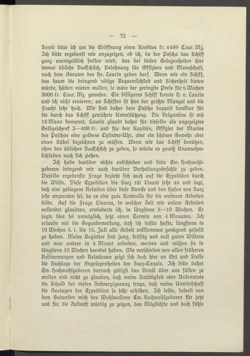 Somit bitte ich um die Eröffnung eines Kredites fr. 6489 Tour. M3. Ich bitte ergebenst mir anzuzeigen, ob ich, da der Pascha das Schiff ganz unentgeltlich stellen wird, das bei diesen Gelegenheiten hier immer übliche Backschisch, Belohnung für Offiziere und Mannschaft, nach dem Anraten des Hr. Laurin geben darf. Wenn wir ein Schiff, das kaum die dringend nötige Bequemlichkeit und Sicherheit bieten würde, hätten mieten wollen, so wäre der geringste Preis für 6 Wochen 3000 fr. Tour. M3. gewesen. Ein billigeres Schiff konnte H. v. Laurin und ich nicht eruieren; an Schiffen ist hier der größte Mangel und die Fracht sehr hoch. Wir sind daher dem Pascha doppelt dankbar für die durch das Schiff gewährte Unterstügung. Die Brigantine ist mit 18 Mann bemannt, Laurin glaubt daher für dieselbe als angezeigtes Geldgeschenk 3-400 fr. und für den Kapitän, Offizier der Marine des Paschas eine goldene Cylinder- Uhr, oder ein schönes Gewehr oder einen Säbel bezeichnen zu müssen. Wenn wir das Schiff benützen, ohne den üblichen Backschisch zu geben, so würde es gewiß Unannehm= lichkeiten nach sich ziehen.