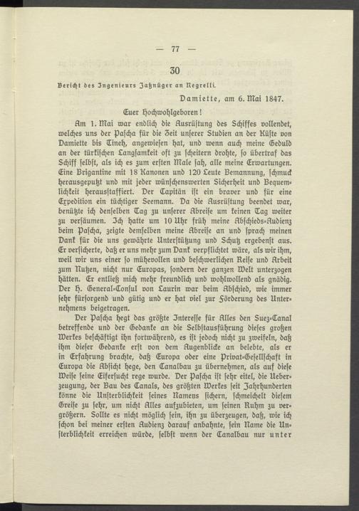 Der Pascha hegt das größte Interesse für Alles den Suez- Canal betreffende und der Gedanke an die Selbstausführung dieses großen Werkes beschäftigt ihn fortwährend, es ist jedoch nicht zu zweifeln, daß ihm dieser Gedanke erst von dem Augenblicke an belebte, als er in Erfahrung brachte, daß Europa oder eine Privat- Gesellschaft in Europa die Absicht hege, den Tanalbau zu übernehmen, als auf diese Weise seine Eifersucht rege wurde. Der Pascha ist sehr eitel, die Ueber= zeugung, der Bau des Canals, des größten Werkes seit Jahrhunderten könne die Unsterblichkeit seines Namens sichern, schmeichelt diesem Greise zu sehr, um nicht Alles aufzubieten, um seinen Ruhm zu vergrößern. Sollte es nicht möglich sein, ihn zu überzeugen, daß, wie ich schon bei meiner ersten Audienz darauf anbahnte, sein Name die Unsterblichkeit erreichen würde, selbst wenn der Canalbau nur unter
