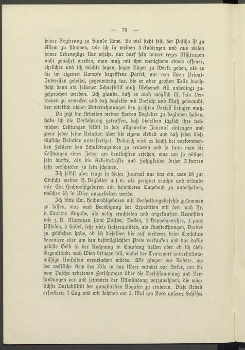 Ich bitte Ew. Hochwohlgeboren mir Verhaltungsbefehle zukommen zu lassen, was nach Beendigung der Expedition mit den nach Hr. v. Laurins Angabe, als nötig erachteten und angekauften Requisiten wie z. B. Matragen samt Polster, Decken, 2 Doppelgewehre, 1 paar Pistolen, 3 Säbel, sehr viele Holzrequisiten, als Aussteckstangen, Bretter zu geschehen habe, ob ich dieselben bis auf weiteres beim Consulate deponiere oder um den bestmöglichsten Preis verkaufen und das dafür gelöste Geld in der Rechnung in Empfang stellen oder ob ich diese Gegenstände nach Wien bringen soll, wobei der Transport unverhältnismäßige Umkosten verursachen würde. Wir gingen vor Rosette, wo der westliche Arm des Nils in das Meer mündet vor Anker, um die vom Pascha erbetenen Forschungen über die Verschlammung und Ver= sandungen vor und seitwärts der Nilmündung vorzunehmen, die mög= lichste Variabilität der gangbarsten Bogasen zu eruieren. Diese Arbeit erforderte 1 Tag und wir kehrten am 3. Mai am Bord unseres Schiffes