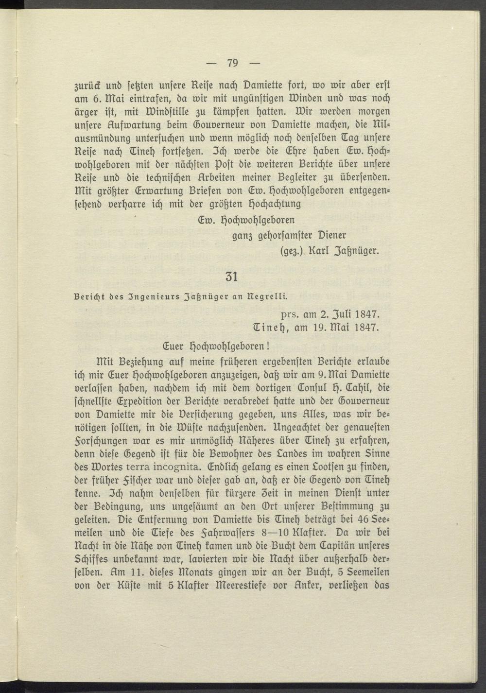Mit Beziehung auf meine früheren ergebensten Berichte erlaube ich mir Euer Hochwohlgeboren anzuzeigen, daß wir am 9. Mai Damiette verlassen haben, nachdem ich mit dem dortigen Consul H. Tahil, die schnellste Expedition der Berichte verabredet hatte und der Gouverneur von Damiette mir die Versicherung gegeben, uns Alles, was wir benötigen sollten, in die Wüste nachzusenden. Ungeachtet der genauesten Forschungen war es mir unmöglich Näheres über Tineh zu erfahren, denn diese Gegend ist für die Bewohner des Landes im wahren Sinne des Wortes terra incognita. Endlich gelang es einen Lootsen zu finden, der früher Fischer war und dieser gab an, daß er die Gegend von Tineh kenne. Ich nahm denselben für kürzere 3eit in meinen Dienst unter der Bedingung, uns ungesäumt an den Ort unserer Bestimmung zu geleiten. Die Entfernung von Damiette bis Tineh beträgt bei 46 See= meilen und die Tiefe des Fahrwassers 8-10 Klafter. Da wir bei Nacht in die Nähe von Tineh kamen und die Bucht dem Tapitän unseres Schiffes unbekannt war, lavierten wir die Nacht über außerhalb derselben. Am 11. dieses Monats gingen wir an der Bucht, 5 Seemeilen von der Küste mit 5 Klafter Meerestiefe vor Anker, verließen das