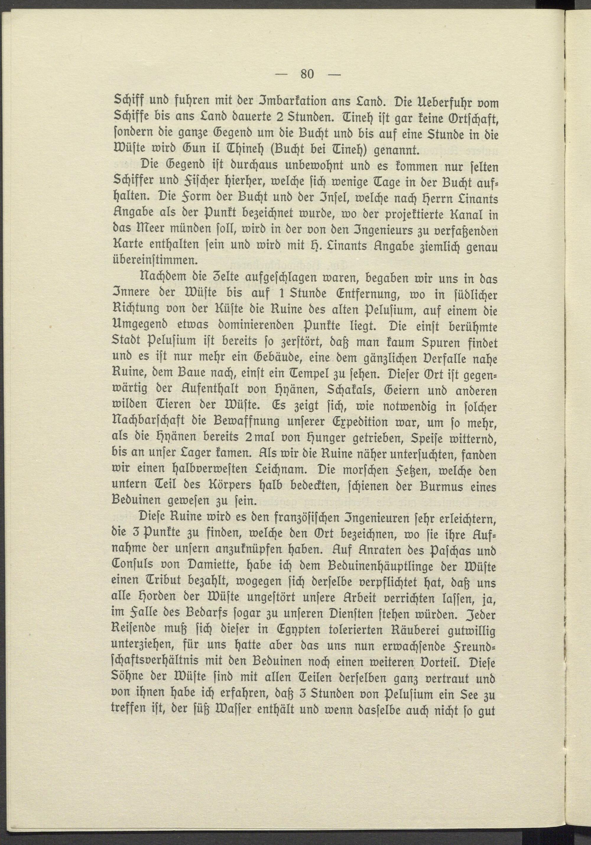 Diese Ruine wird es den französischen Ingenieuren sehr erleichtern, die 3 Punkte zu finden, welche den Ort bezeichnen, wo sie ihre Aufnahme der unsern anzuknüpfen haben. Auf Anraten des Paschas und Consuls von Damiette, habe ich dem Beduinenhäuptlinge der Wüste einen Tribut bezahlt, wogegen sich derselbe verpflichtet hat, daß uns alle Horden der Wüste ungestört unsere Arbeit verrichten lassen, ja, im Falle des Bedarfs sogar zu unseren Diensten stehen würden. Jeder Reisende muß sich dieser in Egypten tolerierten Räuberei gutwillig unterziehen, für uns hatte aber das uns nun erwachsende Freundschaftsverhältnis mit den Beduinen noch einen weiteren Vorteil. Diese Söhne der Wüste sind mit allen Teilen derselben ganz vertraut und von ihnen habe ich erfahren, daß 3 Stunden von Pelusium ein See zu treffen ist, der süß Wasser enthält und wenn dasselbe auch nicht so gut