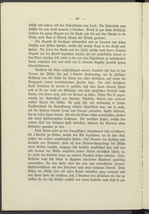 Schiff und fuhren mit der Imbarkation ans Land. Die Ueberfuhr vom Schiffe bis ans Land dauerte 2 Stunden. Tineh ist gar keine Ortschaft, sondern die ganze Gegend um die Bucht und bis auf eine Stunde in die Wüste wird Gun il Thineh( Bucht bei Tineh) genannt.