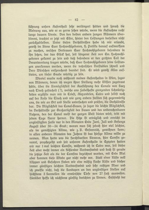 Wieviel wurde noch während meines Aufenthaltes in Wien, sogar von Männern, denen ich wegen ihrer Stellung mehr Wissen zugetraut hätte, über die Unmöglichkeit der Ausführung des Canals von Suez nach Tineh gestachelt(?), welche ans fabelhafte grenzenden Schwierigkeiten erzählte man mir in Triest, Alexandrien, Cairo und selbst noch auf der Reise bis Tineh und wie ganz anders stellten sich gegenwärtig uns, die wir an Ort und Stelle untersuchen und prüfen, die Verhältnisse dar. Die Möglichkeit des Canal- Baues, ja sogar die leichte Möglichkeit, im Verhältnisse zur Großartigkeit des Baues und des unberechenbaren Nutzens, den der Canal meist der ganzen Welt bieten wird, tritt mit jedem Tage klarer hervor. Die Hize ist erträglich und erreicht im ungünstigsten Falle nur in den Monaten Ende Juni, Juli und Anfangs August über 30-34 Grad; woran man sich jedoch hier viel leichter, als im gemäßigten Klima, wie z. B. Oesterreich, gewöhnen kann; in allen anderen Monaten des Jahres ist das hiesige Klima milde zu nennen. Man hatte uns die furchtbarsten Siroccos, hier Tamsin ge= nannt, prophezeiht und seit unserem Aufenthalte in Egypten hatten wir nur 1 mal leichten Camsin, während ich in Cairo war, seit dieser Zeit aber weht immer ein kühlender Nordwestwind und doch ist gerade die jetzige Zeit als die der Camsins bezeichnet worden, mit Ende Mai aber kommen diese Winde gar nicht mehr vor. Statt einer Küste voll Klippen und Gefahren finden wir eine mäßig flache Küste und bisher immer günstigen leichten Nordwestwind und sehr ruhiges meer und ich zweifle nicht, daß die Sandapen an den ungünstigen Stellen auf höchstens 3 Seemeilen die erwünschte Tiefe von 27 Fuß ausweisen. Hierüber hoffe ich nächstens günstig berichten zu können. Geschieht der