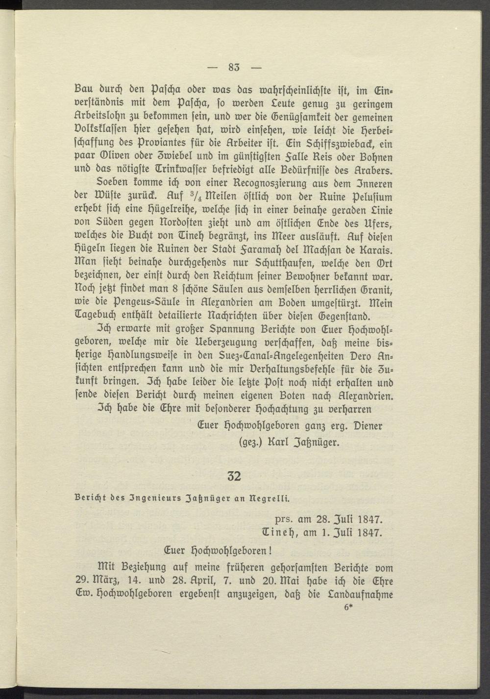 Ich erwarte mit großer Spannung Berichte von Euer Hochwohlgeboren, welche mir die Ueberzeugung verschaffen, daß meine bisherige Handlungsweise in den Suez- Canal- Angelegenheiten Dero Ansichten entsprechen kann und die mir Verhaltungsbefehle für die Jukunft bringen. Ich habe leider die letzte Post noch nicht erhalten und sende diesen Bericht durch meinen eigenen Boten nach Alexandrien. Ich habe die Ehre mit besonderer Hochachtung zu verharren Euer Hochwohlgeboren ganz erg. Diener ( gez.) Karl Jaẞnüger.