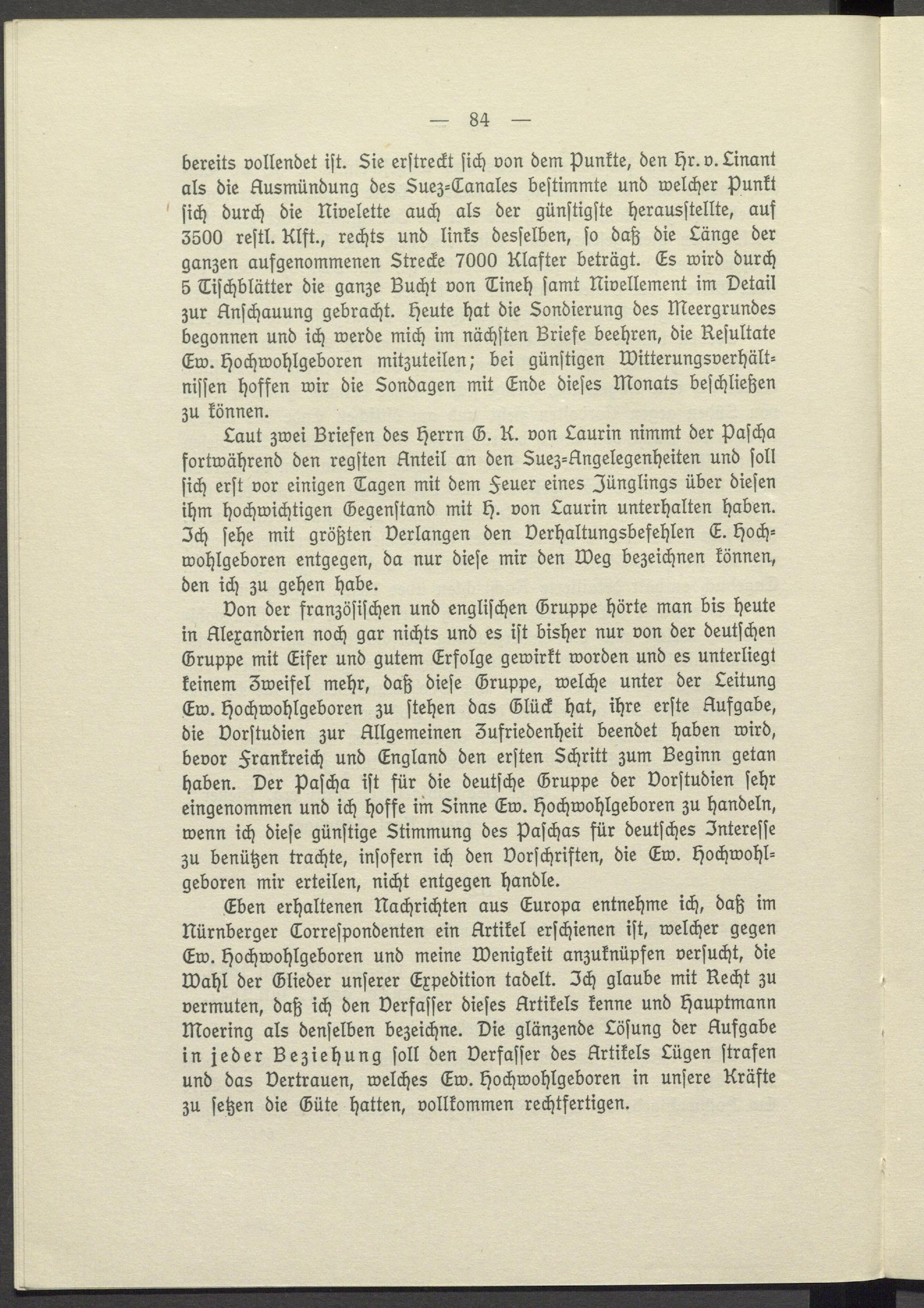 bereits vollendet ist. Sie erstreckt sich von dem Punkte, den Hr. v. Linant als die Ausmündung des Suez- Canales bestimmte und welcher Punkt sich durch die Nivelette auch als der günstigste herausstellte, auf 3500 restl. Klft., rechts und links desselben, so daß die Länge der ganzen aufgenommenen Strecke 7000 Klafter beträgt. Es wird durch 5 Tischblätter die ganze Bucht von Tineh samt Nivellement im Detail zur Anschauung gebracht. Heute hat die Sondierung des Meergrundes begonnen und ich werde mich im nächsten Briefe beehren, die Resultate Ew. Hochwohlgeboren mitzuteilen; bei günstigen Witterungsverhältnissen hoffen wir die Sondagen mit Ende dieses Monats beschließen zu können.