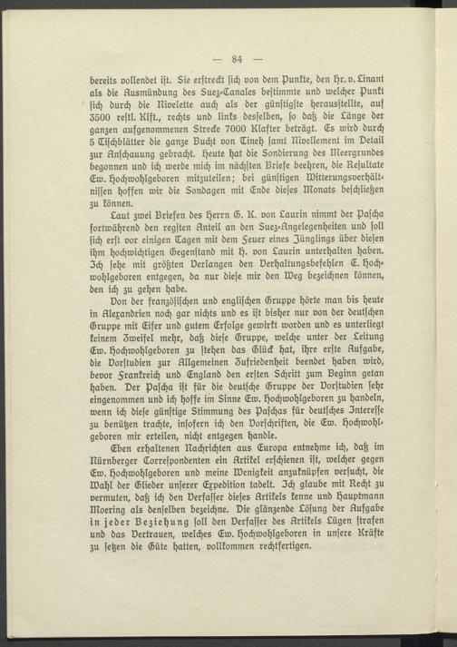 Don der französischen und englischen Gruppe hörte man bis heute in Alexandrien noch gar nichts und es ist bisher nur von der deutschen Gruppe mit Eifer und gutem Erfolge gewirkt worden und es unterliegt keinem Zweifel mehr, daß diese Gruppe, welche unter der Leitung Ew. Hochwohlgeboren zu stehen das Glück hat, ihre erste Aufgabe, die Vorstudien zur Allgemeinen Zufriedenheit beendet haben wird, bevor Frankreich und England den ersten Schritt zum Beginn getan haben. Der Pascha ist für die deutsche Gruppe der Vorstudien sehr eingenommen und ich hoffe im Sinne Ew. Hochwohlgeboren zu handeln, wenn ich diese günstige Stimmung des Paschas für deutsches Interesse zu benützen trachte, insofern ich den Vorschriften, die Ew. Hochwohl= geboren mir erteilen, nicht entgegen handle.
