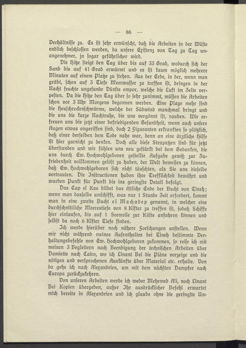 Ich werde hierüber noch nähere Forschungen anstellen. Wenn mir nicht während meines Aufenthaltes bei Tineh bestimmte Ver= haltungsbefehle von Ew. Hochwohlgeboren zukommen, so reise ich mit meinen 3 Begleitern nach Beendigung der technischen Arbeiten über Damiette nach Cairo, wo ich Linant Bei die Pläne vorzeige und die nötigen und versprochenen Auskünfte über Material etc. erhalte. Don da gehe ich nach Alexandrien, um mit dem nächsten Dampfer nach Europa zurückzukehren.