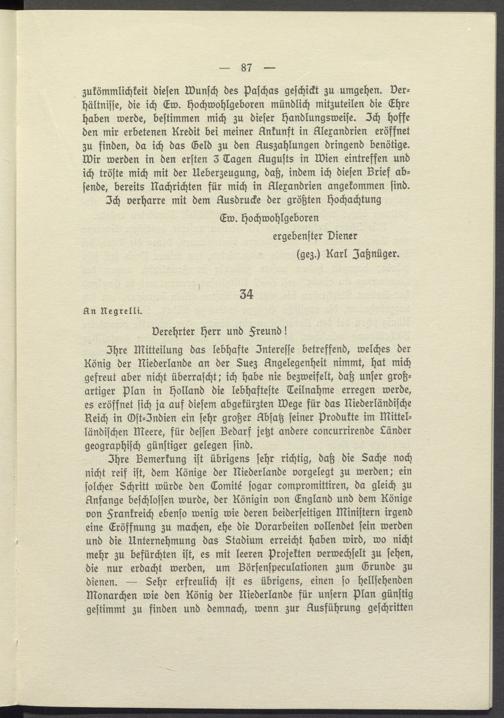Ihre Mitteilung das lebhafte Interesse betreffend, welches der König der Niederlande an der Suez Angelegenheit nimmt, hat mich gefreut aber nicht überrascht; ich habe nie bezweifelt, daß unser großartiger Plan in Holland die lebhafteste Teilnahme erregen werde, es eröffnet sich ja auf diesem abgekürzten Wege für das Niederländische Reich in Ost- Indien ein sehr großer Absah seiner Produkte im Mittelländischen Meere, für dessen Bedarf jetzt andere concurrirende Länder geographisch günstiger gelegen sind.