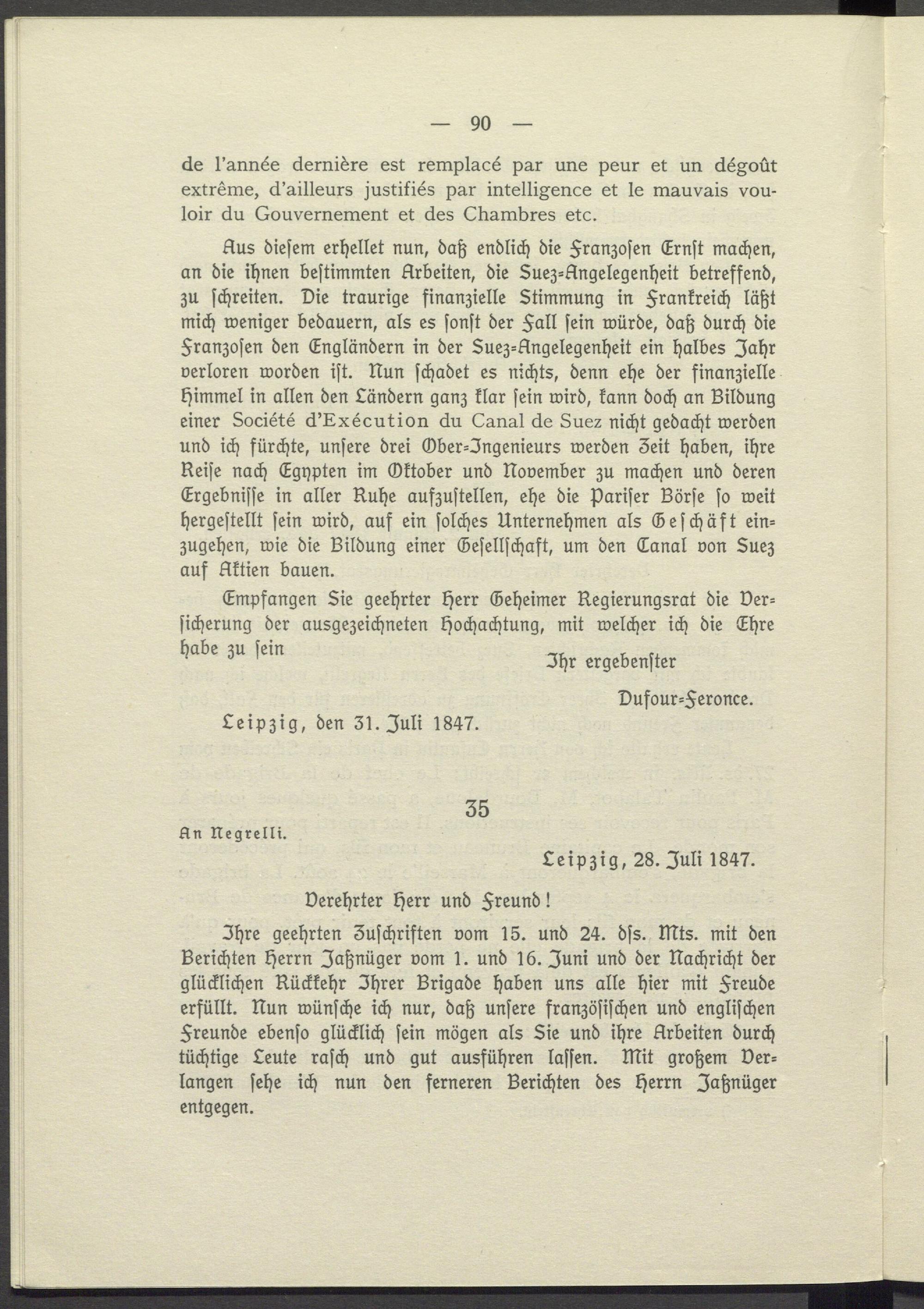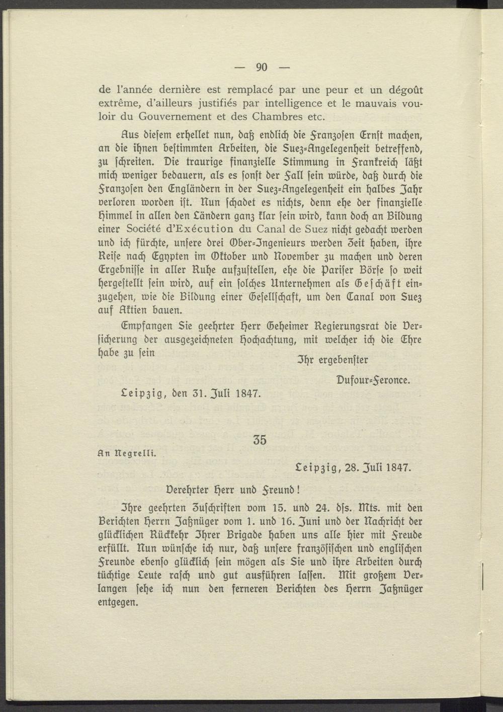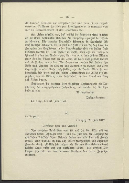 Aus diesem erhellet nun, daß endlich die Franzosen Ernst machen, an die ihnen bestimmten Arbeiten, die Suez- Angelegenheit betreffend, zu schreiten. Die traurige finanzielle Stimmung in Frankreich läßt mich weniger bedauern, als es sonst der Fall sein würde, daß durch die Franzosen den Engländern in der Suez- Angelegenheit ein halbes Jahr verloren worden ist. Nun schadet es nichts, denn ehe der finanzielle Himmel in allen den Ländern ganz klar sein wird, kann doch an Bildung einer Société d'Exécution du Canal de Suez nicht gedacht werden und ich fürchte, unsere drei Ober- Ingenieurs werden Zeit haben, ihre Reise nach Egypten im Oktober und November zu machen und deren Ergebnisse in aller Ruhe aufzustellen, ehe die Pariser Börse so weit hergestellt sein wird, auf ein solches Unternehmen als Geschäft einzugehen, wie die Bildung einer Gesellschaft, um den Canal von Suez auf Aktien bauen.