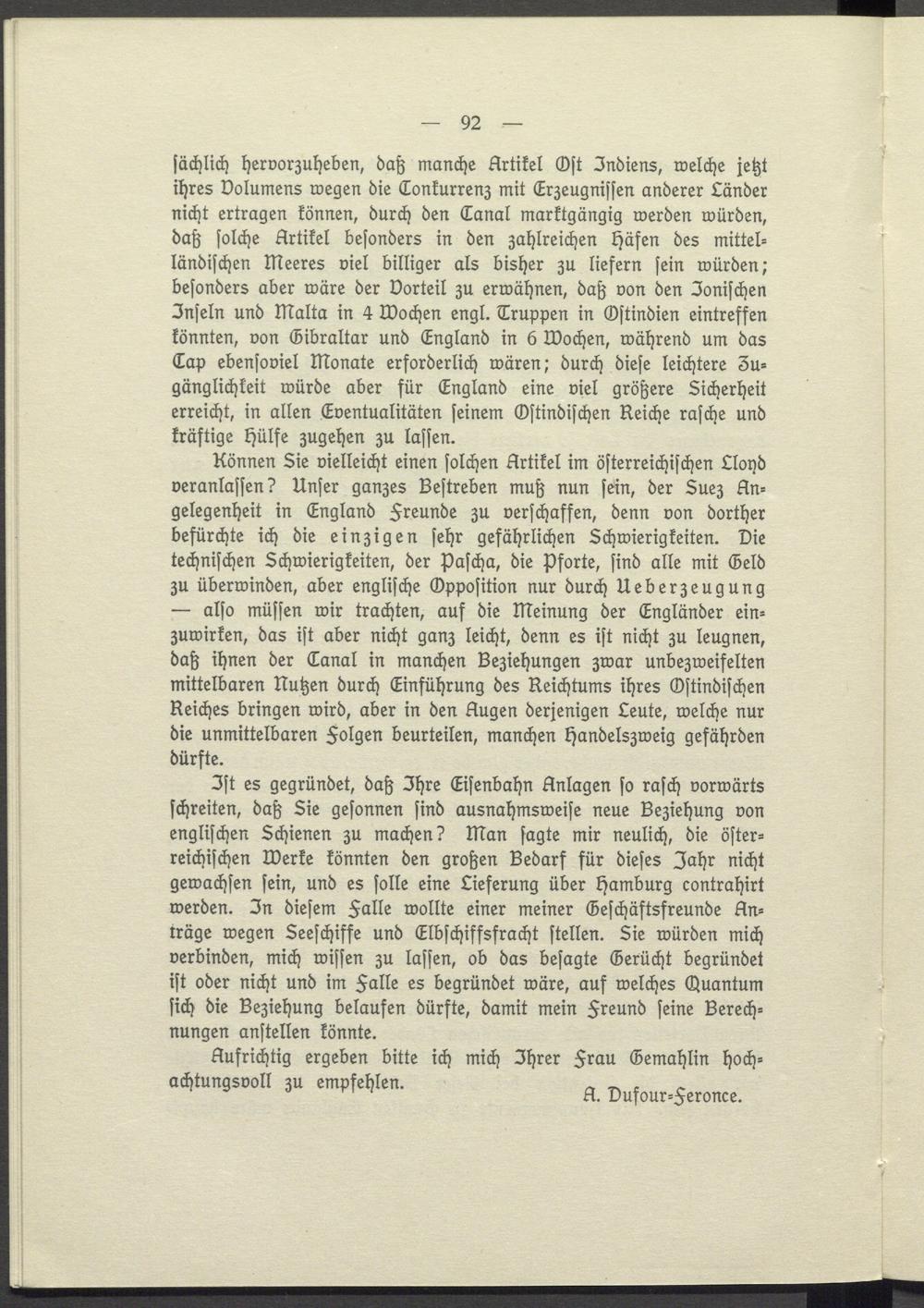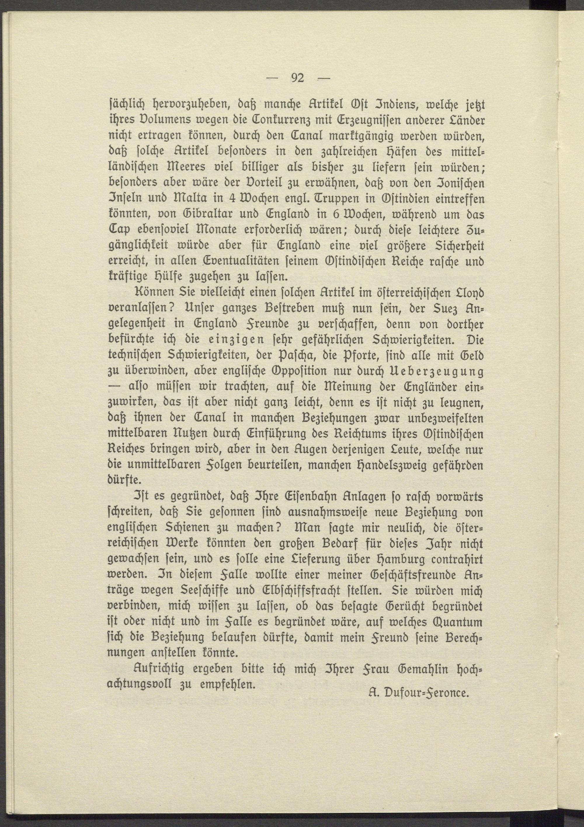 Aufrichtig ergeben bitte ich mich Ihrer Frau Gemahlin hoch= achtungsvoll zu empfehlen. A. Dufour- Feronce.