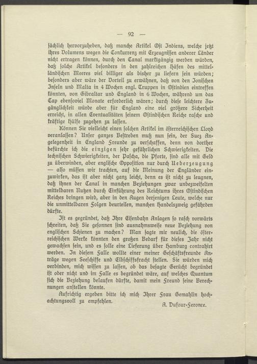 Können Sie vielleicht einen solchen Artikel im österreichischen Llond veranlassen? Unser ganzes Bestreben muß nun sein, der Suez Angelegenheit in England Freunde zu verschaffen, denn von dorther befürchte ich die einzigen sehr gefährlichen Schwierigkeiten. Die technischen Schwierigkeiten, der Pascha, die Pforte, sind alle mit Geld zu überwinden, aber englische Opposition nur durch Ueberzeugung also müssen wir trachten, auf die Meinung der Engländer einzuwirken, das ist aber nicht ganz leicht, denn es ist nicht zu leugnen, daß ihnen der Canal in manchen Beziehungen zwar unbezweifelten mittelbaren Nutzen durch Einführung des Reichtums ihres Ostindischen Reiches bringen wird, aber in den Augen derjenigen Leute, welche nur die unmittelbaren Folgen beurteilen, manchen Handelszweig gefährden dürfte.