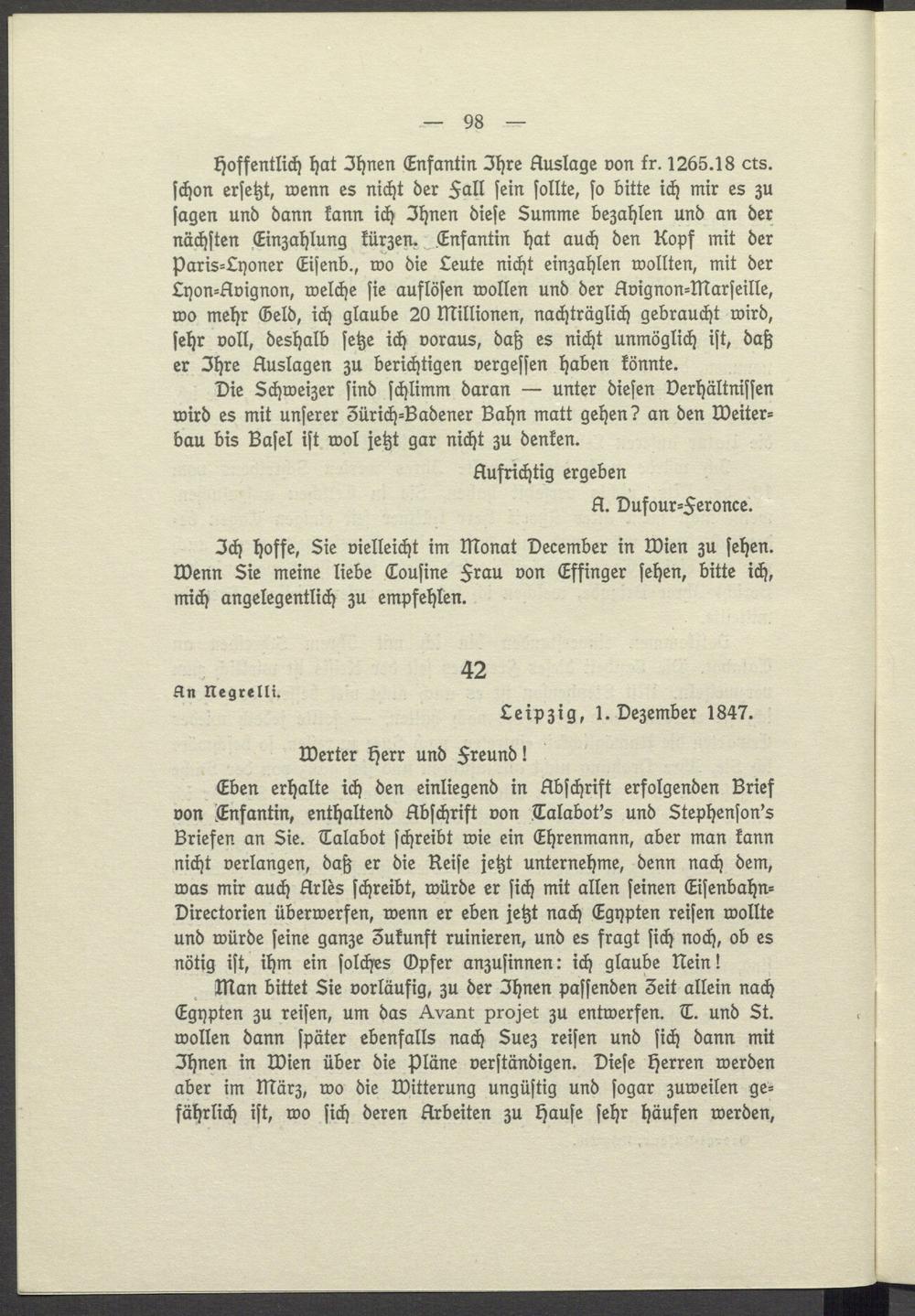 Hoffentlich hat Ihnen Enfantin Ihre Auslage von fr. 1265.18 cts. schon ersetzt, wenn es nicht der Fall sein sollte, so bitte ich mir es zu sagen und dann kann ich Ihnen diese Summe bezahlen und an der nächsten Einzahlung fürzen. Enfantin hat auch den Kopf mit der Paris- Lyoner Eisenb., wo die Leute nicht einzahlen wollten, mit der Lyon- Avignon, welche sie auflösen wollen und der Avignon- Marseille, wo mehr Geld, ich glaube 20 millionen, nachträglich gebraucht wird, sehr voll, deshalb sehe ich voraus, daß es nicht unmöglich ist, daß er Ihre Auslagen zu berichtigen vergessen haben könnte.