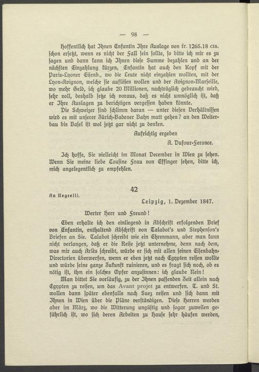 Eben erhalte ich den einliegend in Abschrift erfolgenden Brief von Enfantin, enthaltend Abschrift von Talabot's und Stephenson's Briefen an Sie. Talabot schreibt wie ein Ehrenmann, aber man kann nicht verlangen, daß er die Reise jetzt unternehme, denn nach dem, was mir auch Arlès schreibt, würde er sich mit allen seinen EisenbahnDirectorien überwerfen, wenn er eben jetzt nach Egypten reisen wollte und würde seine ganze Zukunft ruinieren, und es fragt sich noch, ob es nötig ist, ihm ein solches Opfer anzusinnen: ich glaube Nein!